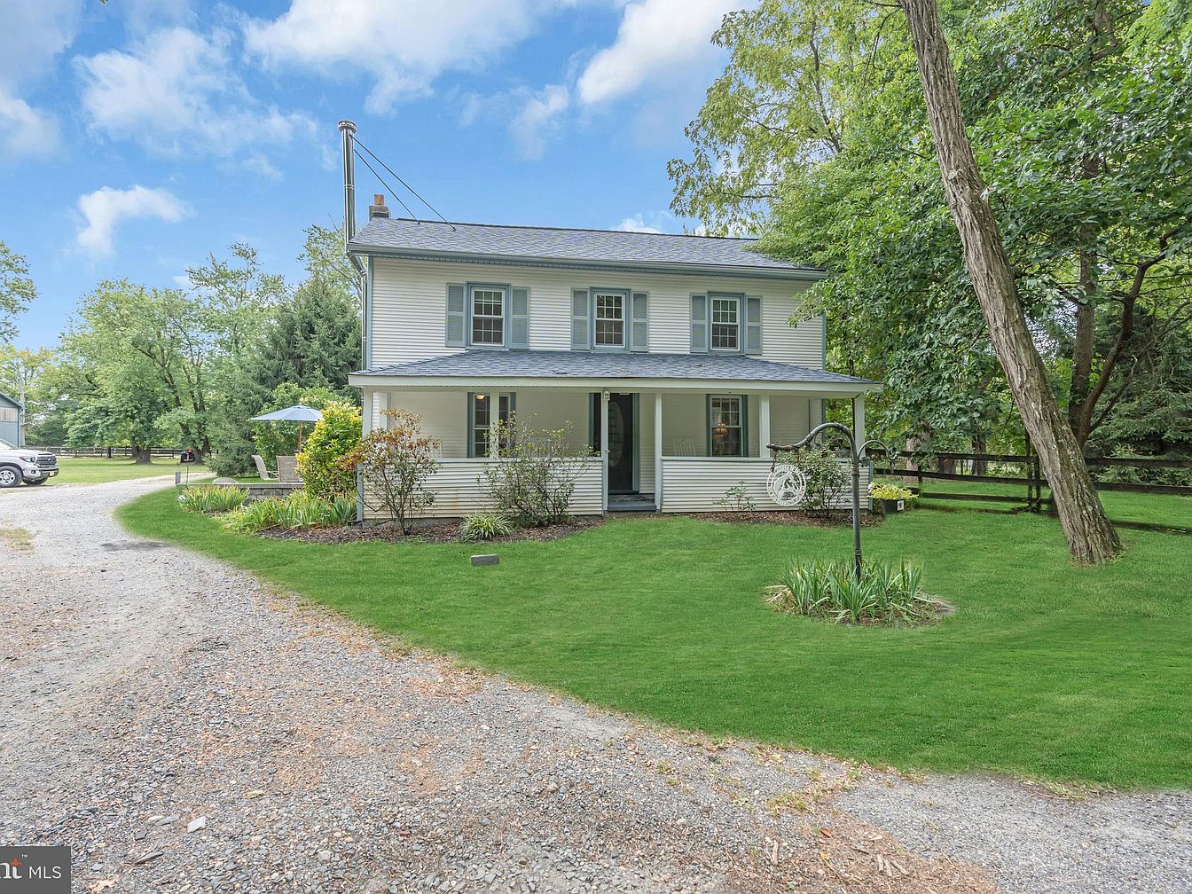 The image shows a charming historic home, featuring a two-story structure with white siding and blue shutters that complement the serene environment. A covered porch invites you with rocking chairs, while the manicured lawn is lush and vibrant, dotted with colorful flower beds. A gravel driveway meanders alongside, leading up to the property. Tall trees provide shade, adding to the overall tranquility. The roof is gabled and adorned with a chimney, hinting at traditional architectural elements. In the background, the landscape includes lush greenery and a hint of outdoor seating beneath a blue umbrella, enhancing the cozy, inviting atmosphere.