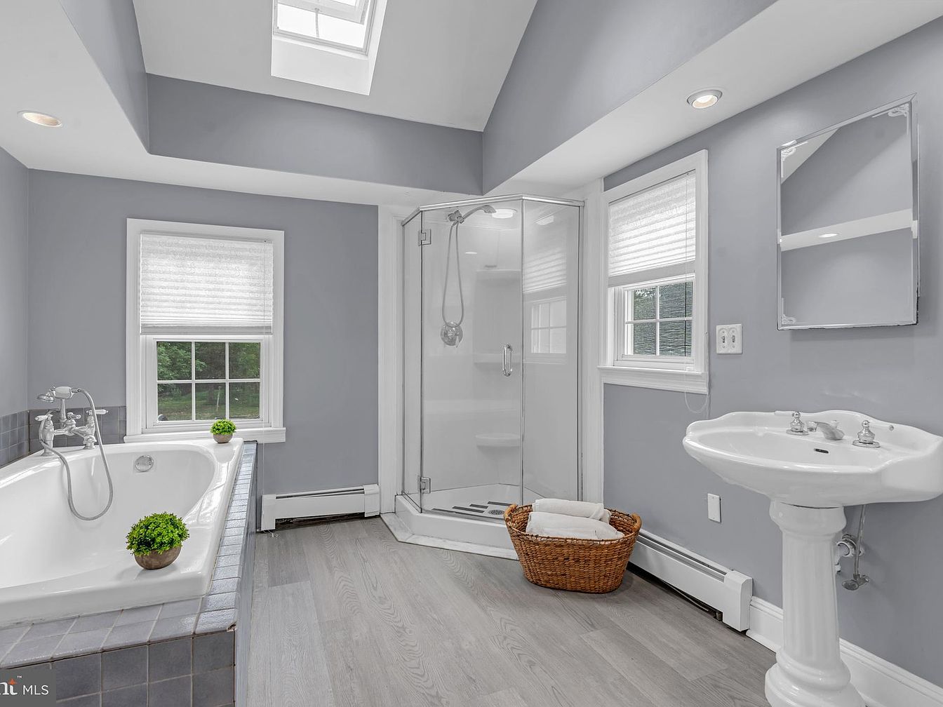 A spacious bathroom featuring a harmonious gray color scheme that promotes tranquility. The layout includes a freestanding soaking tub with a blue-tiled edge, positioned near a window providing natural light. Adjacent is a sleek glass shower enclosure, maximizing space and offering a modern touch. A pedestal sink with vintage faucets complements the aesthetic, accompanied by a wicker basket containing neatly rolled towels. The room is illuminated by recessed lighting and a skylight, enhancing brightness. Two windows dressed with understated blinds overlook greenery, creating a serene atmosphere, while wood-like flooring adds warmth to the contemporary design.