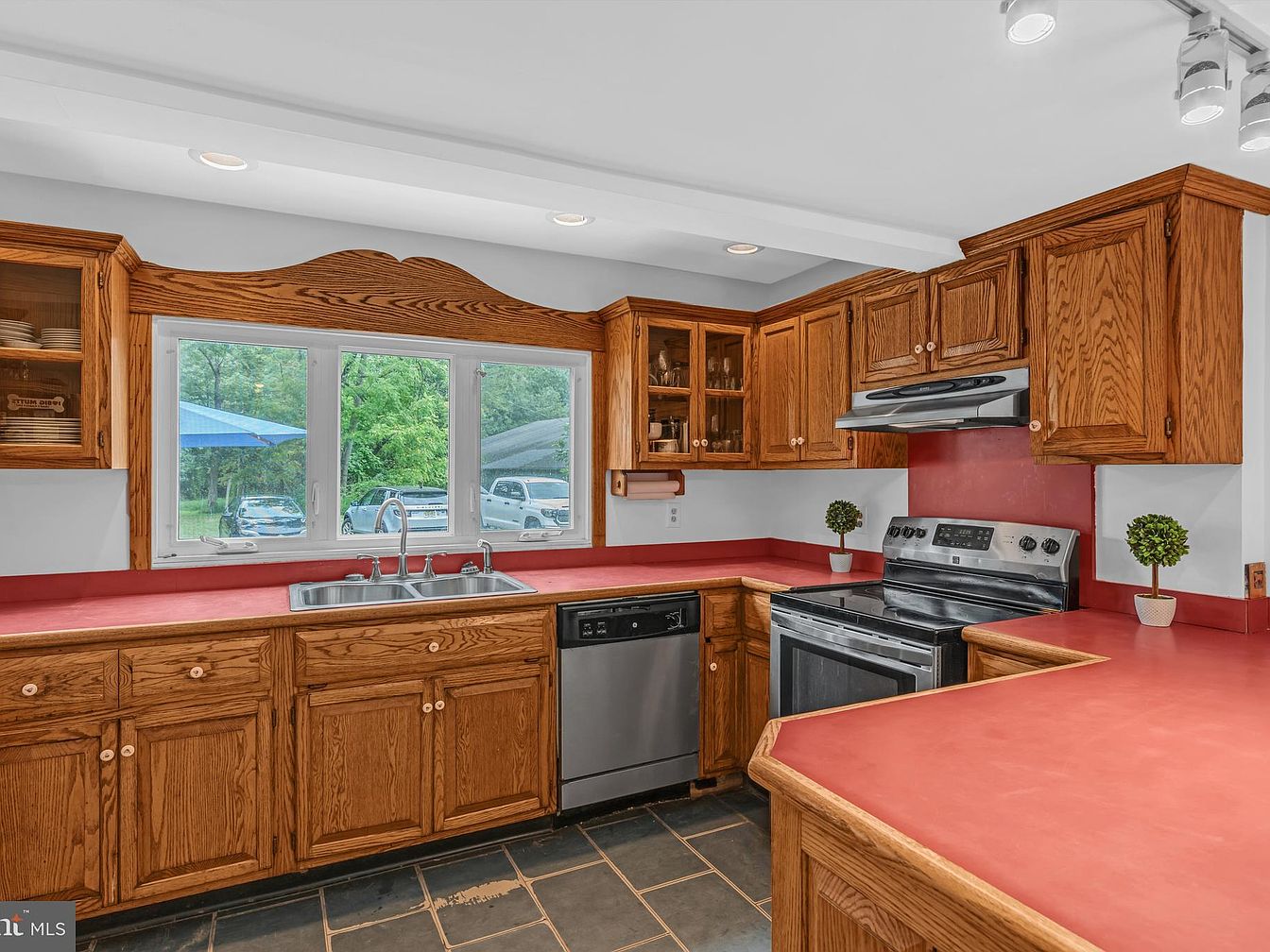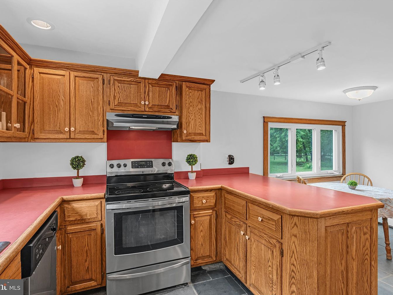 This kitchen features a U-shaped layout with oak cabinetry offering ample storage and a warm, inviting aesthetic. The countertops are a vibrant red, contrasting nicely with the light gray walls and the dark slate flooring. A large window allows natural light to flood the space, making it bright and cheerful. Stainless steel appliances, including a refrigerator and oven, add a contemporary touch. Decorative green plants on the countertop bring a refreshing element, and track lighting provides additional illumination, enhancing the room’s functional and stylish atmosphere.