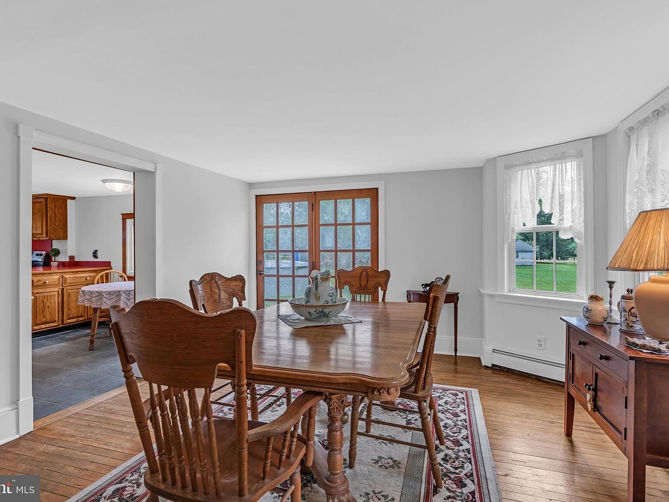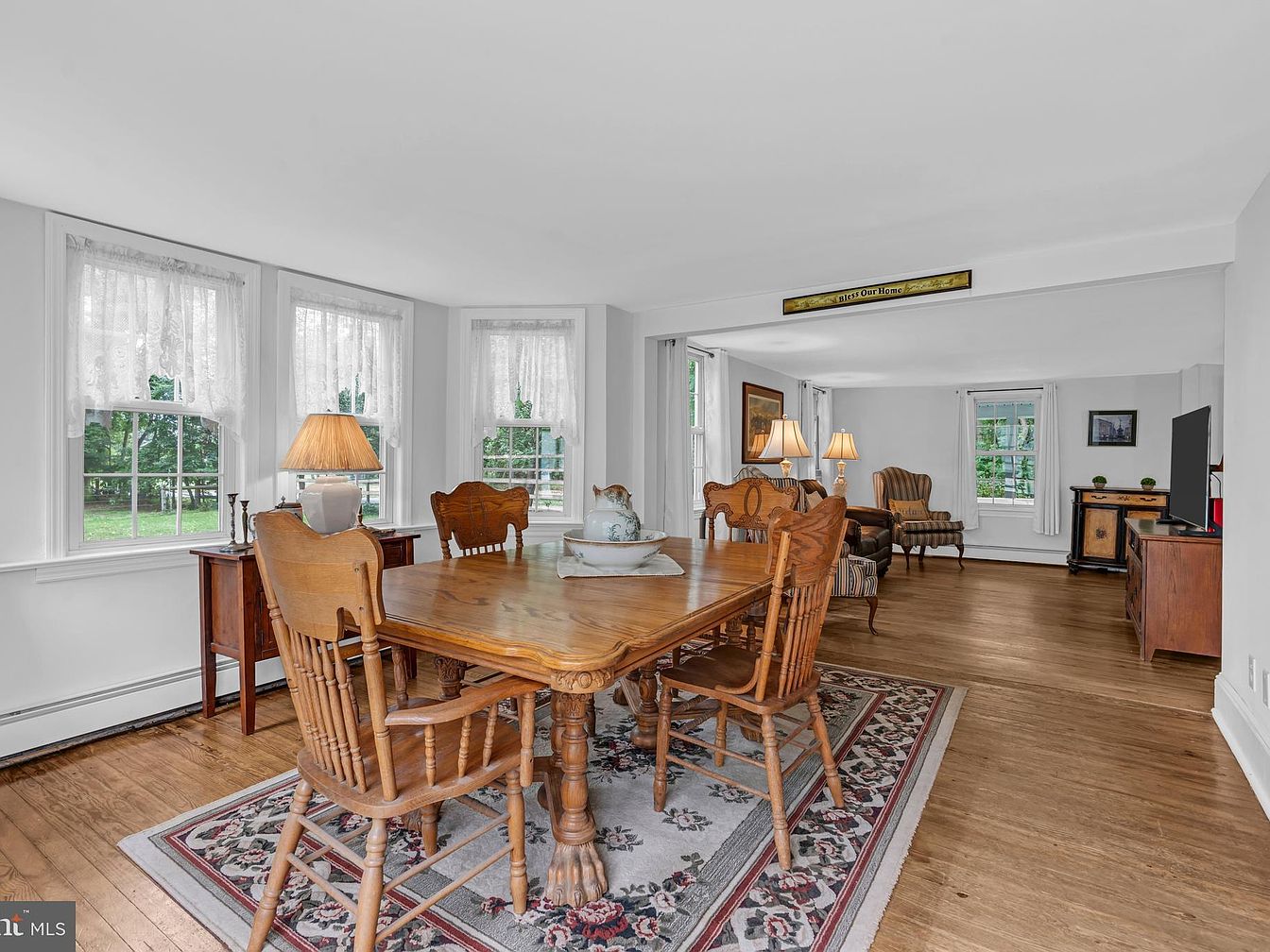 The dining area features a rustic wooden table surrounded by matching spindle-back chairs. A soft, patterned area rug anchors the space, adding warmth to the hardwood flooring. Natural light pours in through three window frames dressed with sheer lace curtains, enhancing the airy atmosphere. A simple table lamp atop a side table offers ambient lighting. Flanking the seating area, two traditional armchairs invite relaxation, complemented by a small cabinet showcasing decorative items. White walls create a clean backdrop for wall art, emphasizing the home’s historic charm while blending comfort with a timeless aesthetic.