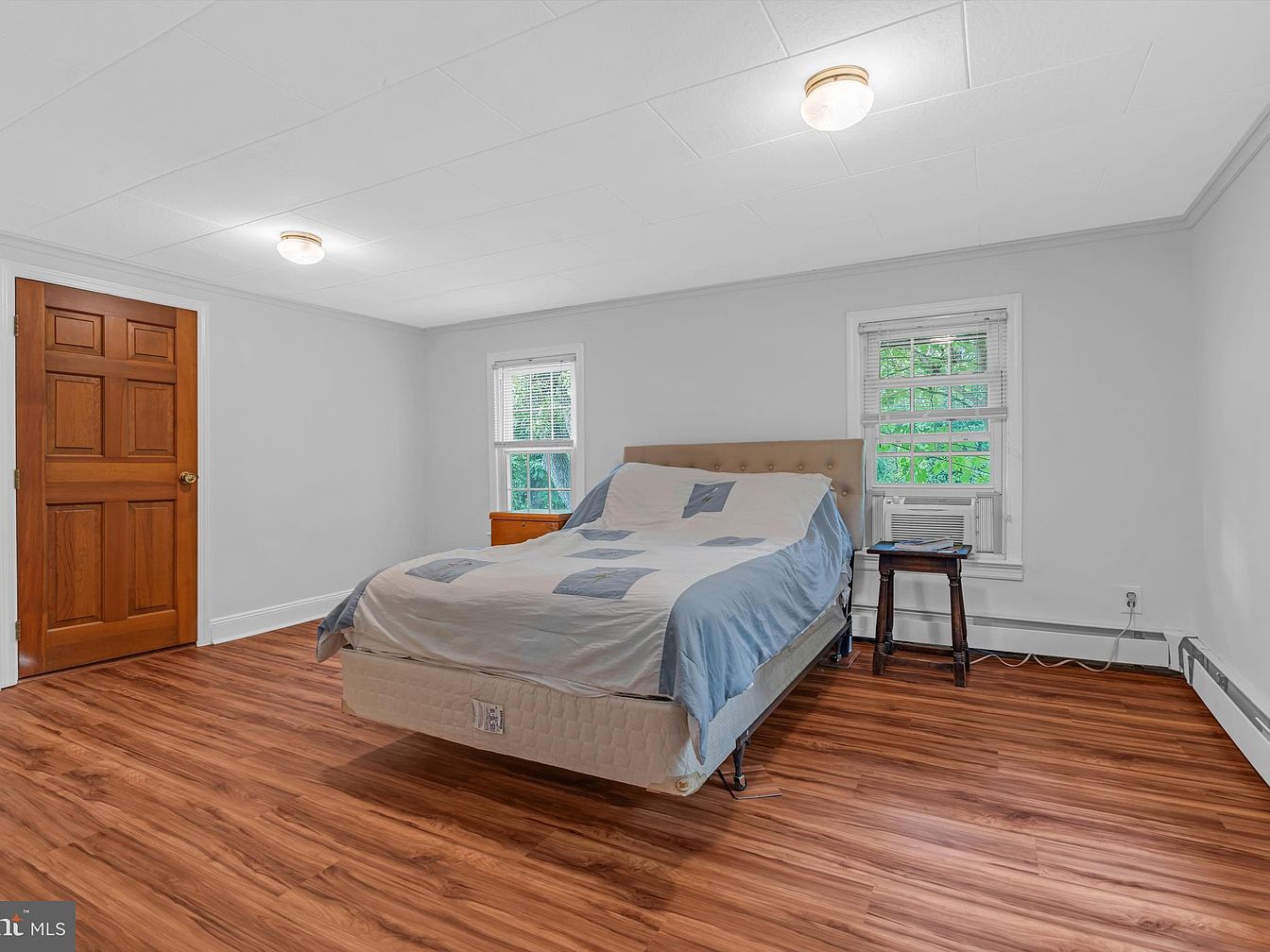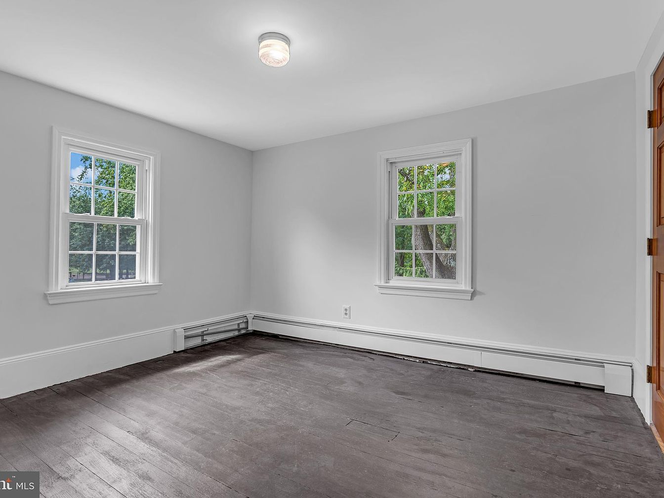 This room features a minimalist design with soft white walls that create a tranquil atmosphere. Natural light floods through two large double-hung windows, showcasing lush greenery outside, enhancing the connection with nature. The dark hardwood floor balances the lightness of the walls, while baseboards and window trims in crisp white provide a classic touch. A modern ceiling light fixture illuminates the space effectively. The room’s layout offers ample space for furnishings, suggesting flexibility for various arrangements. An adjoining door hints at additional areas, maintaining a seamless flow throughout this historic home.