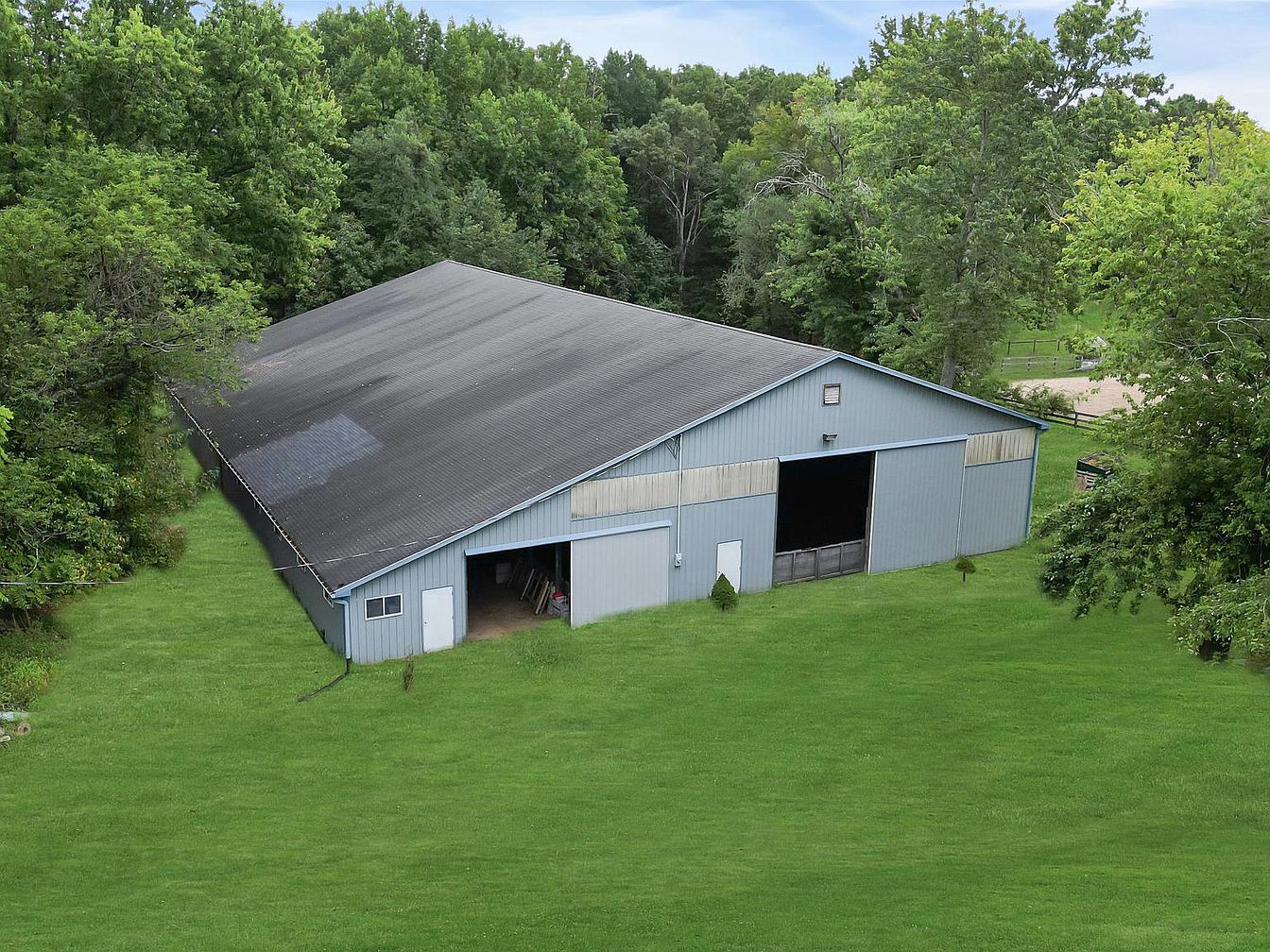 A substantial barn structure featuring a classic gabled roof, clad in a weathered metal exterior with a light gray hue. The spacious entryway is highlighted by two large double doors, allowing easy access for vehicles or livestock. Flanking the main doors, smaller access points enhance functionality. Surrounded by a lush green lawn, the barn blends harmoniously with the natural landscape, which includes a verdant backdrop of trees. The building’s design emphasizes utility, showcasing a traditional agricultural aesthetic, while the trees in the background add a tranquil, rustic charm to the overall scene.