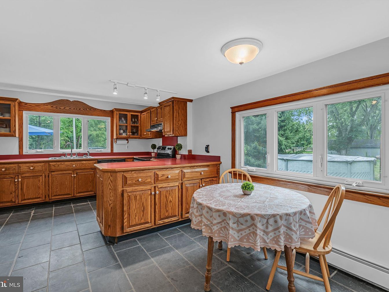 This kitchen features a spacious layout with rich oak cabinetry that provides ample storage. The red countertops create a vibrant contrast against the light-colored walls, enhancing the warmth of the wood. A modern stainless steel stove and dishwasher add a contemporary touch. Above the counter, track lighting illuminates the area, emphasizing the work space. Large windows allow natural light to flood in, offering a view of the greenery outside. A small dining area with a round wooden table and a floral tablecloth complements the rustic charm, making this kitchen both functional and inviting.