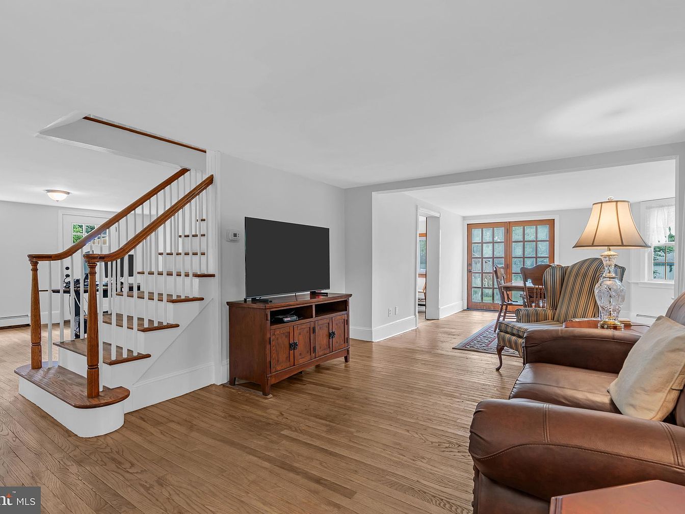 This spacious living room features a neutral color palette, emphasizing the warmth of the rich wooden flooring. An elegant set of wooden stairs leads to the upper level, flanked by white balusters that add an airy feel. A dark wooden TV stand contrasts with the light walls, providing a classic aesthetic. The seating area includes a brown leather recliner paired with a striped armchair, creating a cozy nook. A glass lamp with intricate detailing provides a warm glow, while a patterned area rug adds texture. Light streams through the adjacent dining area, inviting an open, welcoming atmosphere.
