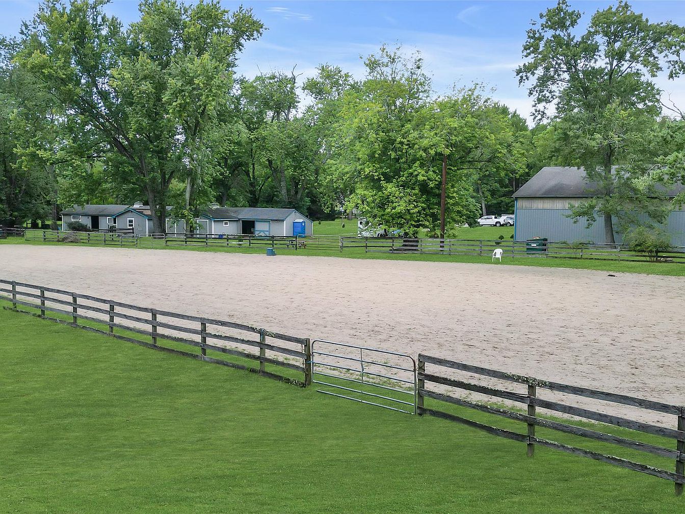 A spacious riding arena features a sandy surface, bordered by a wooden fence, creating an ideal area for equestrian activities. The background showcases various structures, including small sheds and a larger building, all set against a lush green landscape adorned with tall trees. The arrangement of the trees provides shade and adds a natural element to the scene. Well-maintained grass surrounds the arena, enhancing the overall aesthetics. Sunlight filters through the trees, casting soft shadows on the sand, creating a peaceful environment for horseback riding and outdoor enjoyment.