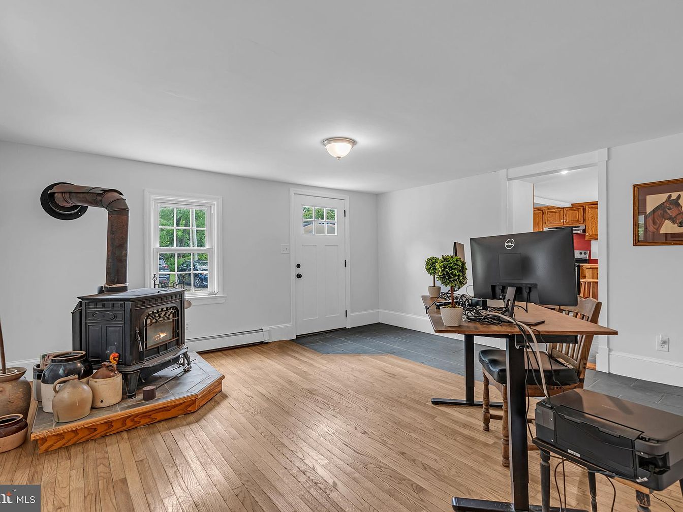 This entryway features a combination of rustic charm and modern functionality. A cast-iron wood stove is situated prominently, providing warmth and aesthetic appeal. Surrounding the stove are various pottery pieces that add a touch of character. The walls are painted in a bright white, complementing the natural light streaming through the double-hung windows. A sleek, dark tile floor transitions smoothly to the warm-hued hardwood. To the right, a wooden desk with a computer sits beneath a potted plant, balancing modern work elements with the traditional setting. A simple door leads further into the home.