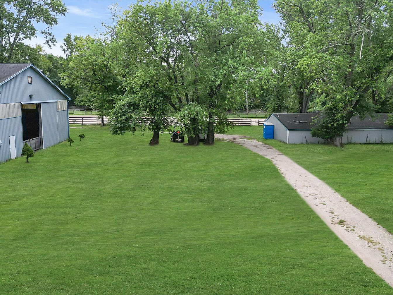 A vast, manicured lawn stretches across the foreground, boasting rich green grass. Large, leafy trees punctuate the landscape, providing natural shade and a relaxed atmosphere. To the left, a large blue barn with sliding doors invites utility, while to the right, a smaller structure, possibly a shed, wears a matching blue hue. A gravel path meanders through the lawn, connecting different areas and leading to trees at the center. A pop of color appears with a blue portable restroom near the small structure. The tranquil setting captures the essence of rural charm and outdoor living.