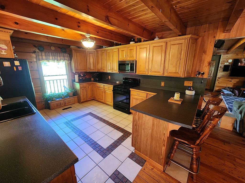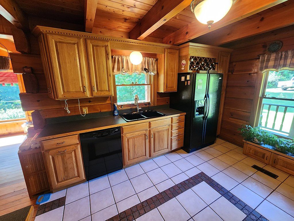 This cozy kitchen features warm wooden cabinetry, showcasing a rustic charm typical of a log home. Light brown wood contrasts with dark countertops, enhancing the inviting atmosphere. The layout includes an L-shaped counter with a central island, offering ample workspace. A decorative border of tiled accents on the floor adds visual interest, while large windows bring in natural light and views of potted plants outside. Appliances like a black stove and a spacious sink are modern yet blend well with the traditional aesthetics. Exposed wooden beams on the ceiling contribute to the overall warmth and hominess of the space.