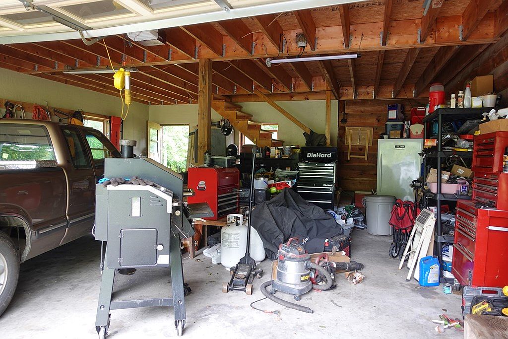 A functional garage filled with an assortment of items and tools. The space features exposed wooden beams and a concrete floor, creating a rustic ambiance. A brown pickup truck occupies one side, while various equipment, including a black grill and a vacuum, are scattered throughout. Brightly colored toolboxes in red and green contrast with the monochromatic elements. Shelving units hold supplies, while bright yellow lighting adds warmth. Windows provide natural light, illuminating the cluttered yet practical layout. The overall aesthetic combines utilitarian elements with hints of personal touch, reflecting a space dedicated to hobbies and storage.