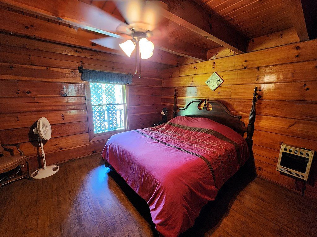 This cozy bedroom features warm wooden walls, creating an inviting and rustic atmosphere. A large window, adorned with a dark valance, allows natural light to flood the space, highlighting the rich texture of the logs. The bed is centered against the wall, dressed in a vibrant red bedspread that contrasts elegantly with the wood tones. Decorative pillows add a touch of comfort. A classic wooden fan gently circulates the air, while a small fan and heater are conveniently placed near the bed. The floor showcases dark laminate, adding to the room’s warmth and charm. Unique wall decor completes the aesthetic.