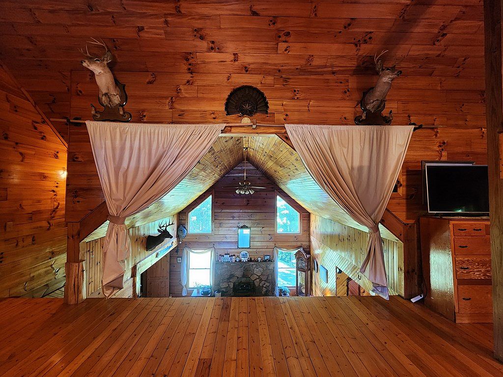 The loft area showcases a rustic charm with warm wooden beams and paneling throughout. The ceiling features a vaulted design, enhancing the spacious feel, while light filters in through large windows. Comfortable cream curtains frame two windows, offering soft contrast against the rich hues of the wood. Mounted deer heads on either side add a classic hunting lodge ambiance. Below, a stone fireplace serves as a focal point, accompanied by decorative knick-knacks atop a mantel. The polished wooden floor reflects the natural light, complementing the inviting atmosphere, making it an ideal retreat for relaxation.