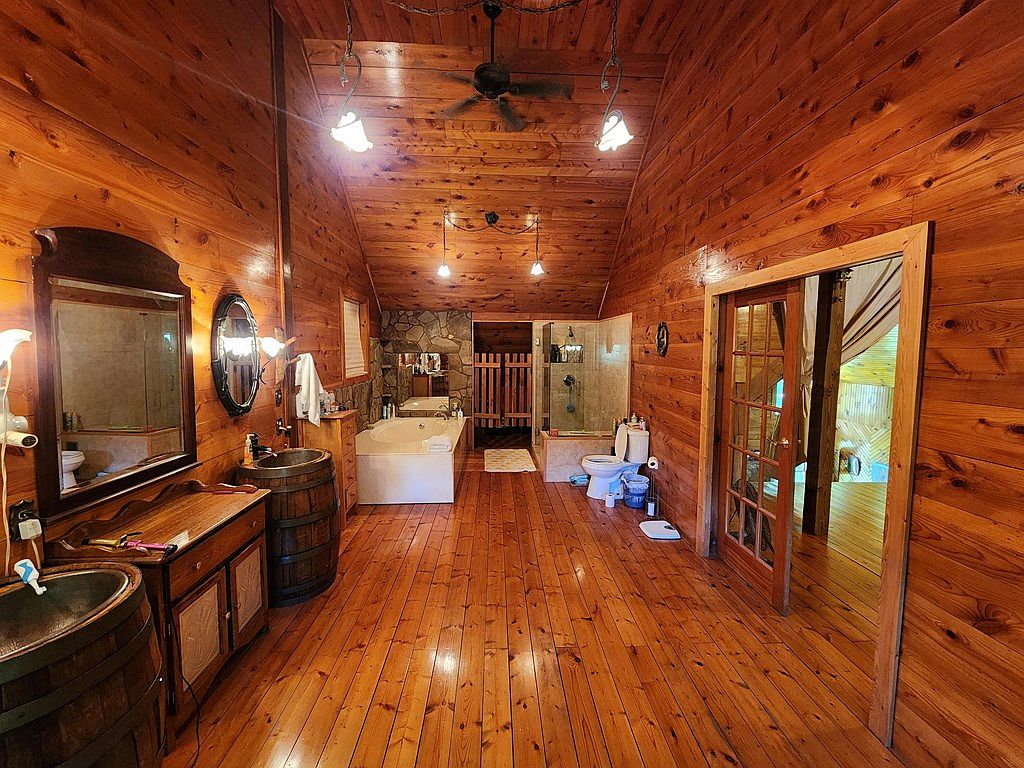 This spacious bathroom features warm wood paneling and rich wooden flooring, creating a cozy and inviting atmosphere. The layout includes dual barrel-style sinks with vintage mirrors, enhancing rustic charm. A large soaking tub is positioned centrally, alongside a glass-enclosed shower area. The soft lighting from multiple fixtures complements the natural wood tones. A decorative wall combines stone elements with the wood, adding texture. French doors lead to another room, enriching the openness of the space. Subtle decor items maintain a minimalist aesthetic, ensuring the room feels serene and comfortable while showcasing natural materials.