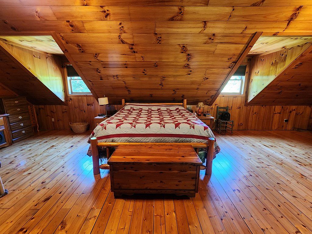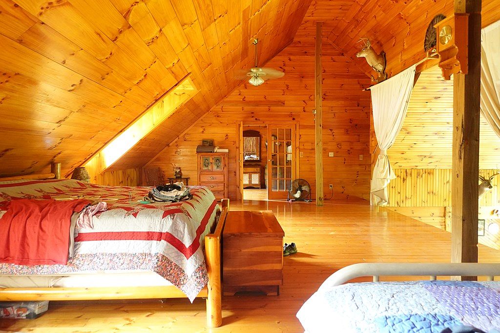 This cozy bedroom features a sloped ceiling accentuated by warm, honey-colored wood paneling that creates an inviting atmosphere. A large bed adorned with a quilt showcases a traditional pattern, complemented by vibrant red and white tones. Natural light filters through a window, illuminating the hardwood floor, which adds to the rustic charm. A wooden dresser sits across from the bed, complete with classic decor elements. Decorative touches, such as animal mounts near the apex of the ceiling and strategically placed drapes, enhance the cabin feel. Overall, the room merges comfort with a historical, nature-inspired aesthetic.