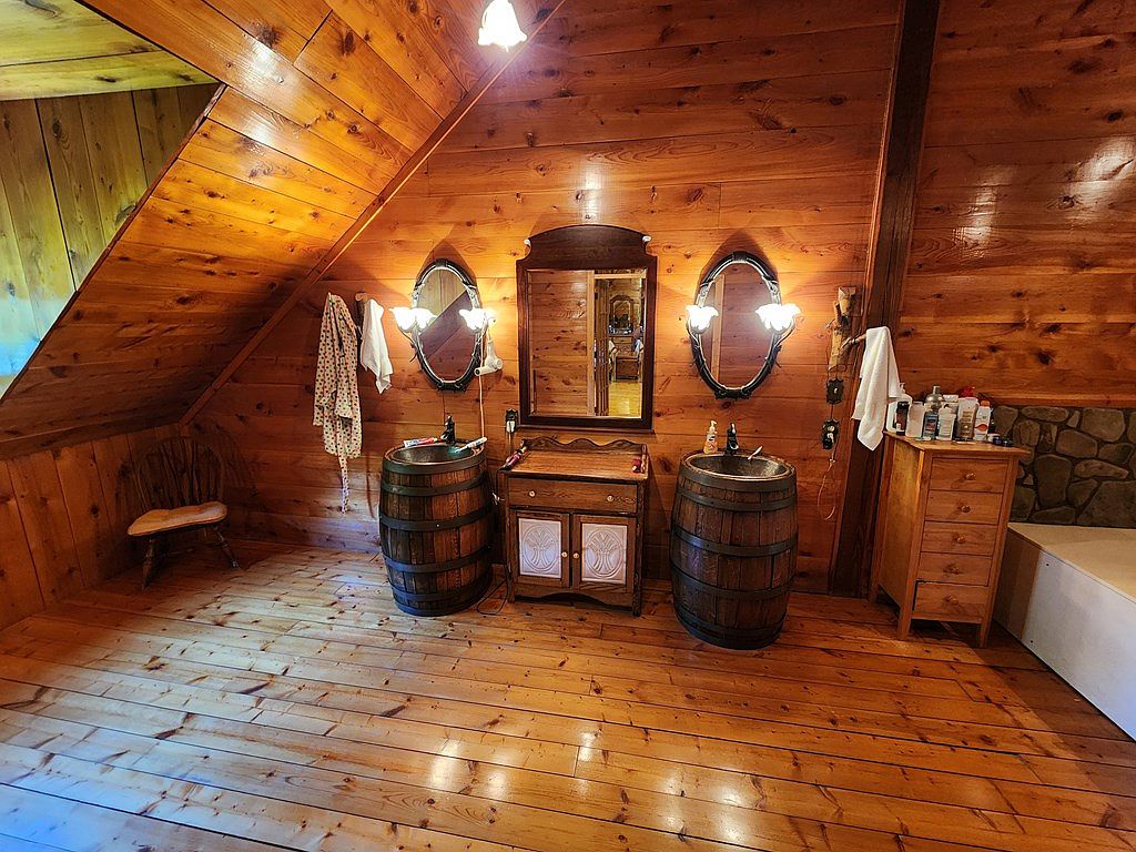 The space features a cozy, rustic bathroom with warm wooden tones throughout. The walls and ceiling are adorned with rich, stained wood panels, creating an inviting atmosphere. A unique vanity setup consists of two wooden barrels as sinks, complementing a charming antique mirror above. Bright sconces illuminate the area, enhancing its warmth. A small wooden dresser stands nearby, offering storage. The rich oak flooring contrasts nicely with the light wooden fixtures. Textiles such as a patterned robe hang casually, adding a personal touch. Overall, this bathroom blends functional design with rustic aesthetics, emphasizing nature-inspired elements.