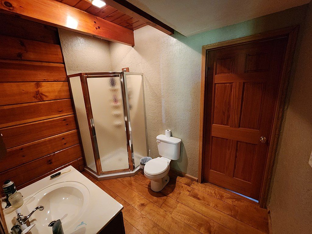 This bathroom features a combination of modern and rustic elements. The layout includes a clear glass shower enclosure with a subtle frosted texture, positioned next to a white toilet. A wooden door with a classic panel design provides access to an adjacent area. The flooring is composed of warm, rich wooden planks, enhancing the natural feel. On the left, the wall showcases elegant wooden paneling, which contrasts the lighter, textured wall on the right. A white vanity sink, accompanied by minimalist accessories, is visible, contributing to the clean and spacious aesthetic. Warm overhead lighting illuminates the area effectively.