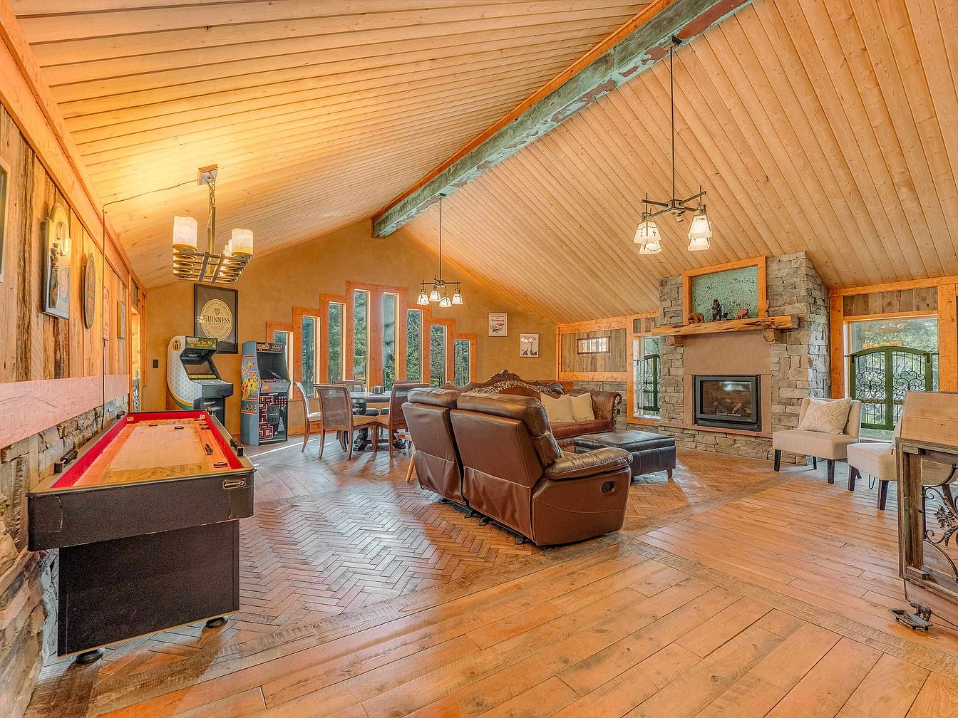 A spacious game room features a warm color palette with rustic wooden elements. High, sloped ceilings with exposed beams complement the tongue-and-groove wood paneling. A stone fireplace acts as a focal point, surrounded by comfortable seating, including a plush dark leather sofa. The flooring showcases herringbone-patterned hardwood, enhancing the room’s cozy atmosphere. A game table sits well-lit by pendant lighting above, while an arcade machine and air hockey table add a playful touch. Large windows frame the area, inviting natural light and showcasing views, contributing to the inviting, recreational vibe of the space.