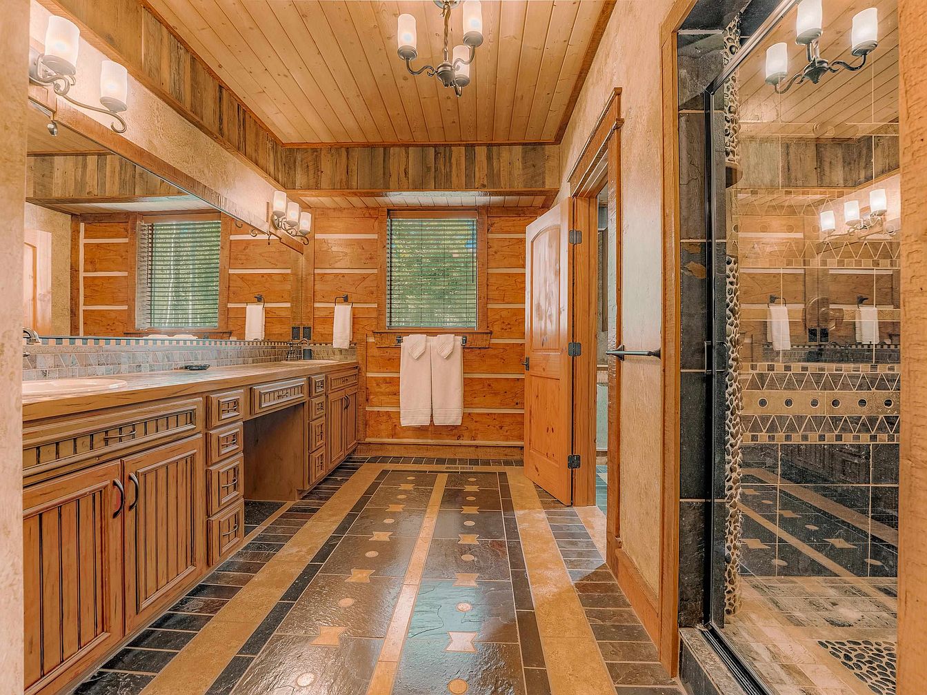 This spacious bathroom features warm wooden accents with a rustic charm. The walls are adorned with natural wood paneling, and the ceiling showcases a wooden finish. A long vanity with intricate detailing offers ample storage beneath a countertop, complemented by stylish wall-mounted lighting. The floor is arranged in a striking pattern of dark and light tiles, interspersed with star motifs, leading to the glass-enclosed shower. Large windows provide natural light, while soft white towels are neatly hung. The overall color scheme of earthy tones and textures creates a serene, inviting atmosphere.