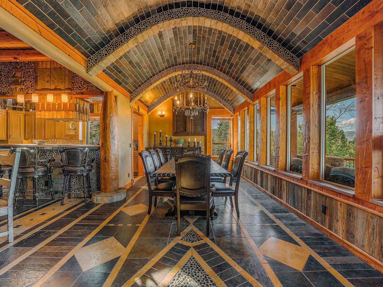 A spacious dining room featuring a dramatic arched ceiling adorned with dark slate tiles. The room showcases a long, elegant dining table surrounded by black upholstered chairs, creating a sophisticated atmosphere. A chandelier hangs above, adding a touch of elegance. The flooring combines geometric patterns in black, cream, and earthy tones, beautifully contrasted with wooden accents along the walls. Large windows on either side invite natural light, offering picturesque views outside. The rustic wooden beams provide warmth and character, while the unique design elements reflect a blend of modern and traditional aesthetics.
