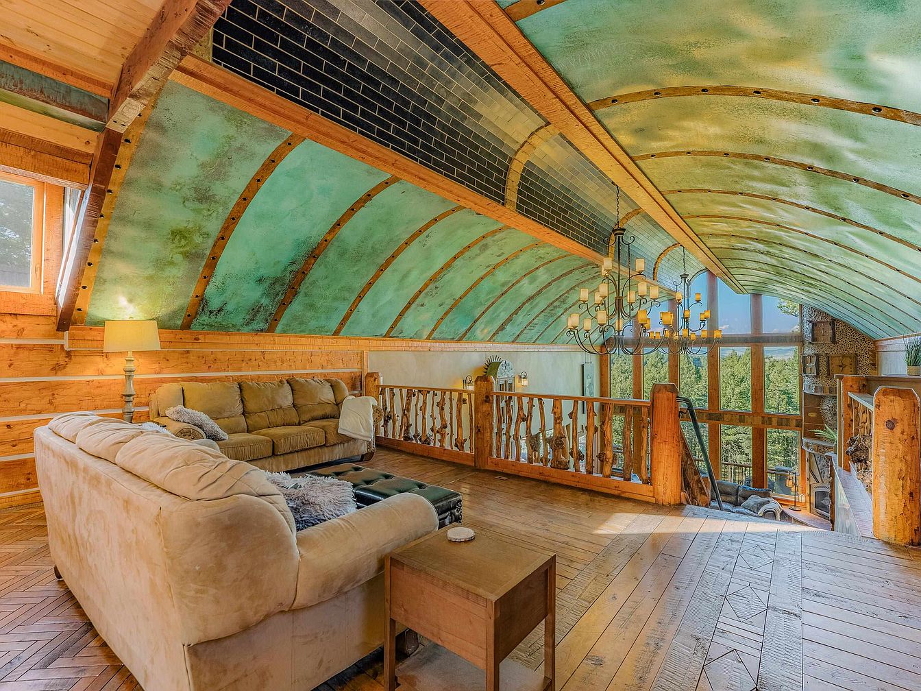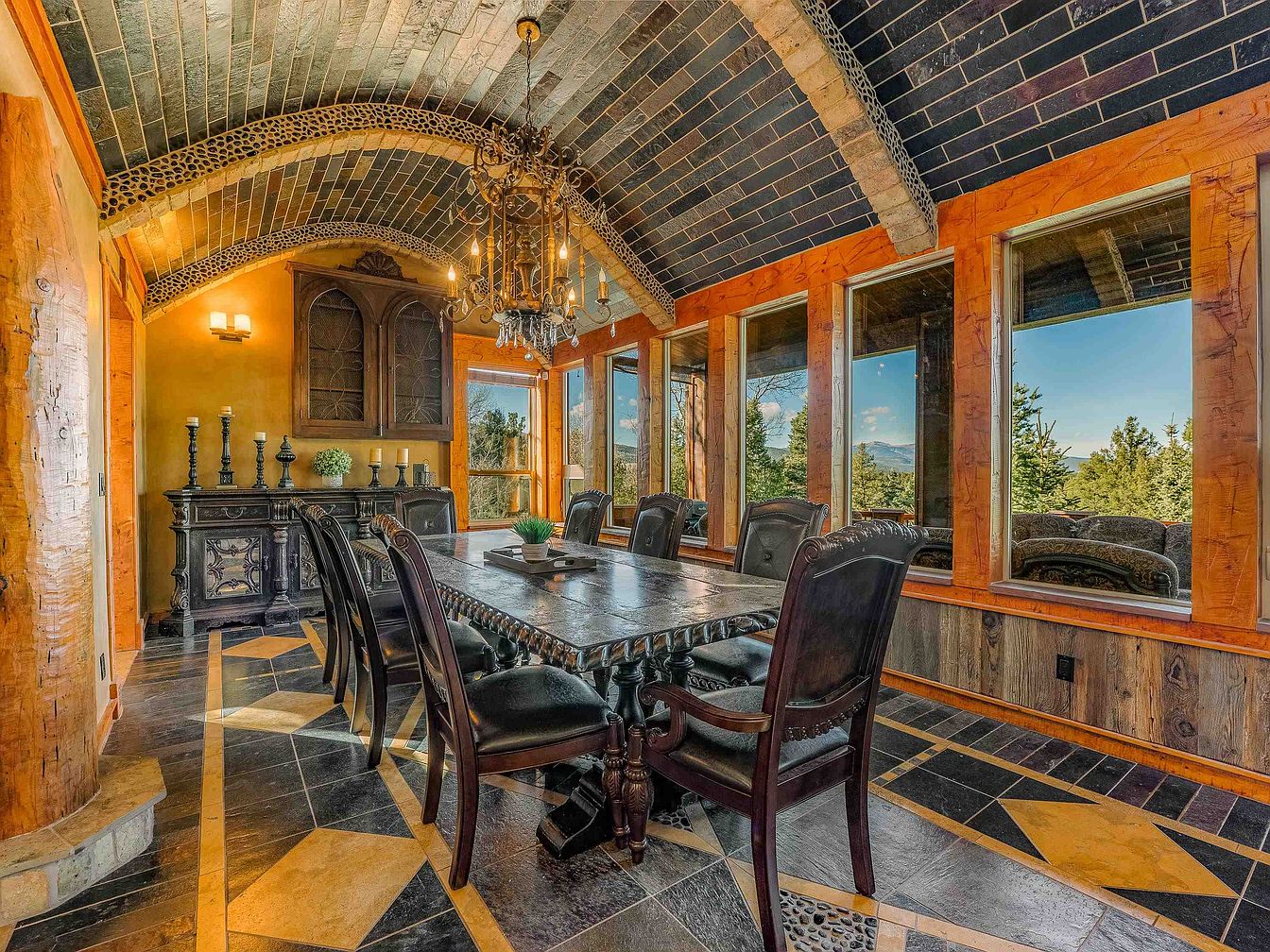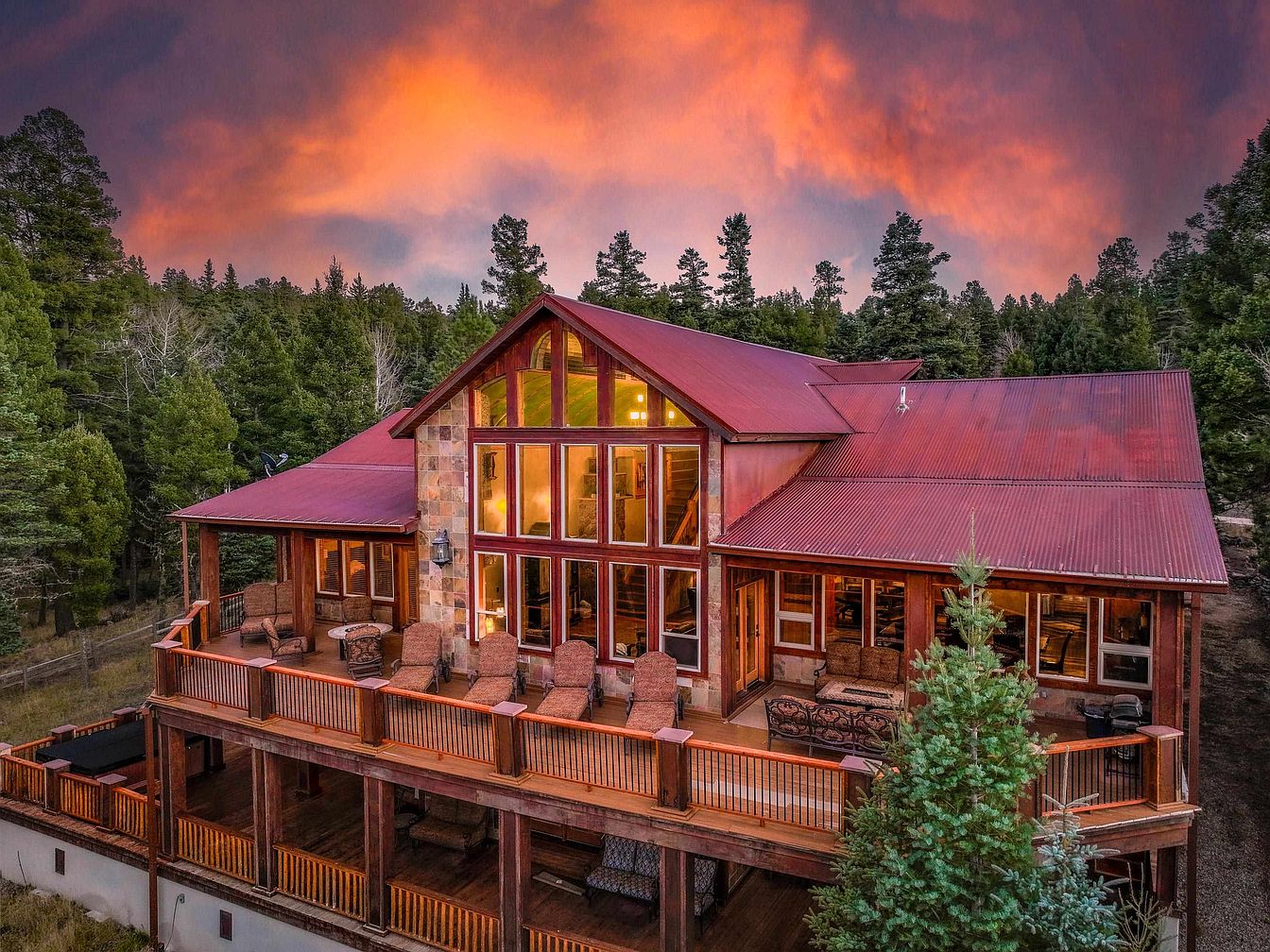 Known as Woodland Castle, this remarkable 7,000 sq. ft. home was crafted by artist Ray Renfro and embodies a distinctive architectural style. Built in a serene location in Angel Fire, NM, the property sits on over 2.5 acres, offering breathtaking views of Wheeler Peak, and is conveniently close to Monte Verde Lake and local amenities. The residence features four primary suites and multiple living areas, highlighting its spacious design and custom details. Recent renovations include fully furnished decks with fire pits and a large hot tub, enhancing the outdoor living experience. Priced at $2,500,000, this stunning home is a true testament to creative architecture, perfectly blending privacy with accessibility.