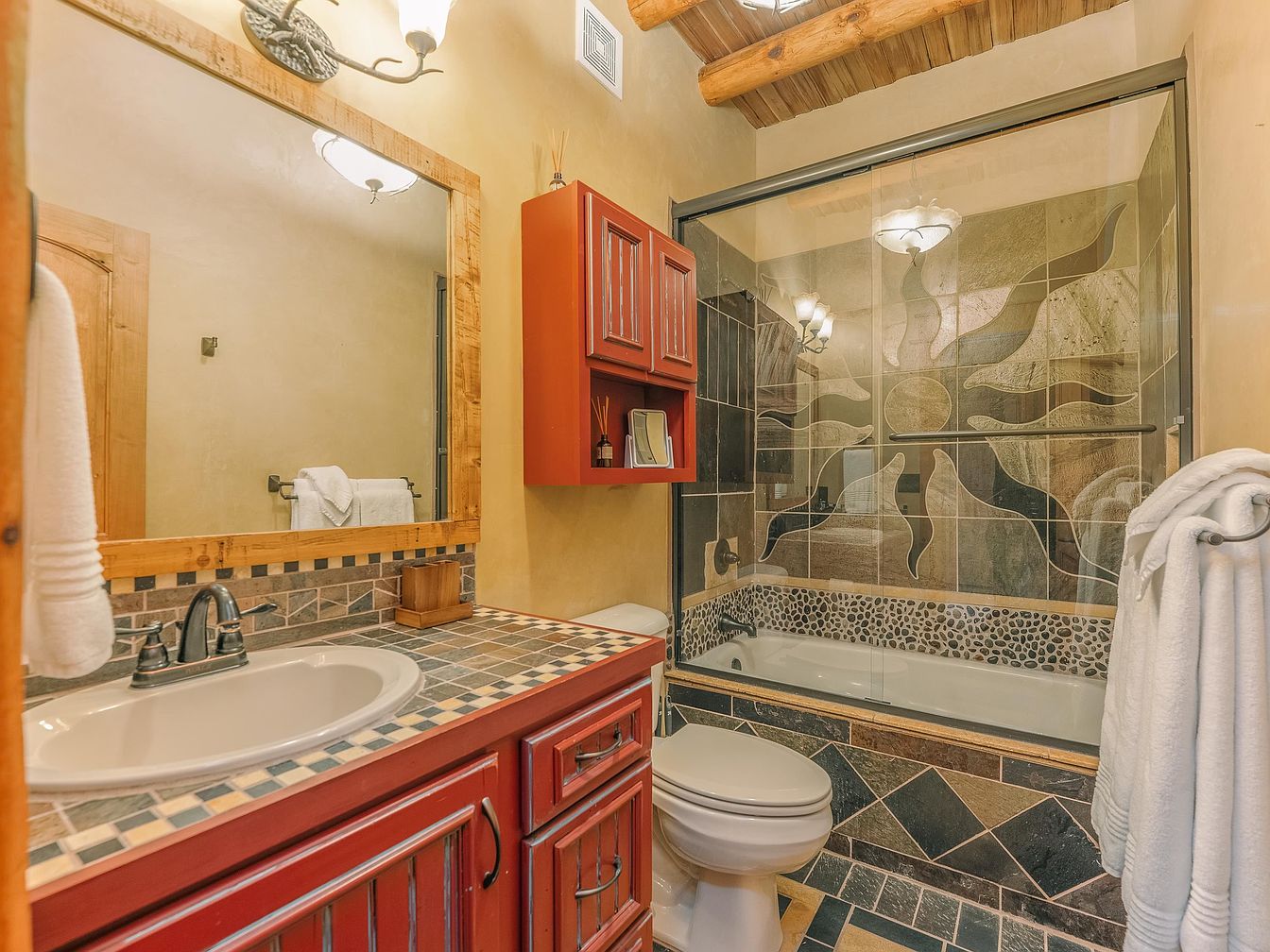 This bathroom features a rustic design, highlighted by a warm color palette of earthy tones. The striking red vanity contrasts beautifully with the decorative tile countertop. A large mirror framed with natural wood adds depth, reflecting the room’s warm light from overhead fixtures. The glass shower enclosure showcases a unique sun-patterned tile design, complemented by natural stone accents. There’s a tasteful blend of textures, including the smooth surfaces of the sink and tub, paired with the intricate patterns of the wall tiles. Soft towels hang neatly, creating a cozy, inviting atmosphere within the space.