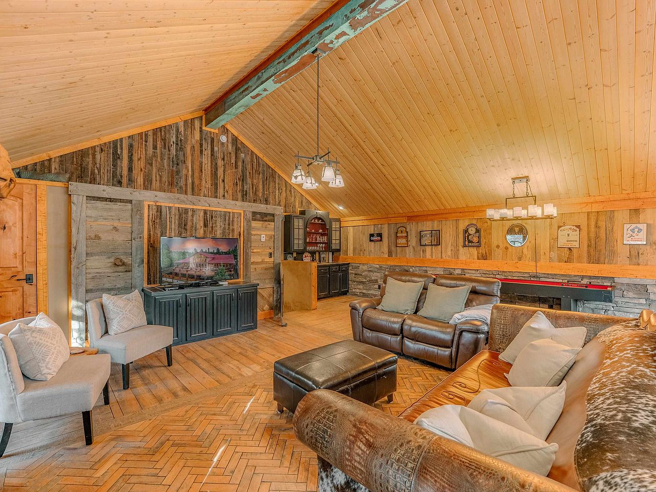 A cozy living room featuring a rustic design with high, sloped wooden ceilings and warm wood paneling. The floor showcases herringbone-patterned hardwood, enhancing the space’s charm. A large, flat-screen TV is mounted on a wooden feature wall, framed by barn-style accents. Comfortable leather sofas, adorned with decorative pillows, provide ample seating, while two gray armchairs invite relaxation. A unique coffee table complements the seating arrangement. Artwork and vintage signs adorn the walls, adding character. A chandelier casts a warm glow over the area, creating an inviting atmosphere, perfect for gatherings or quiet evenings.