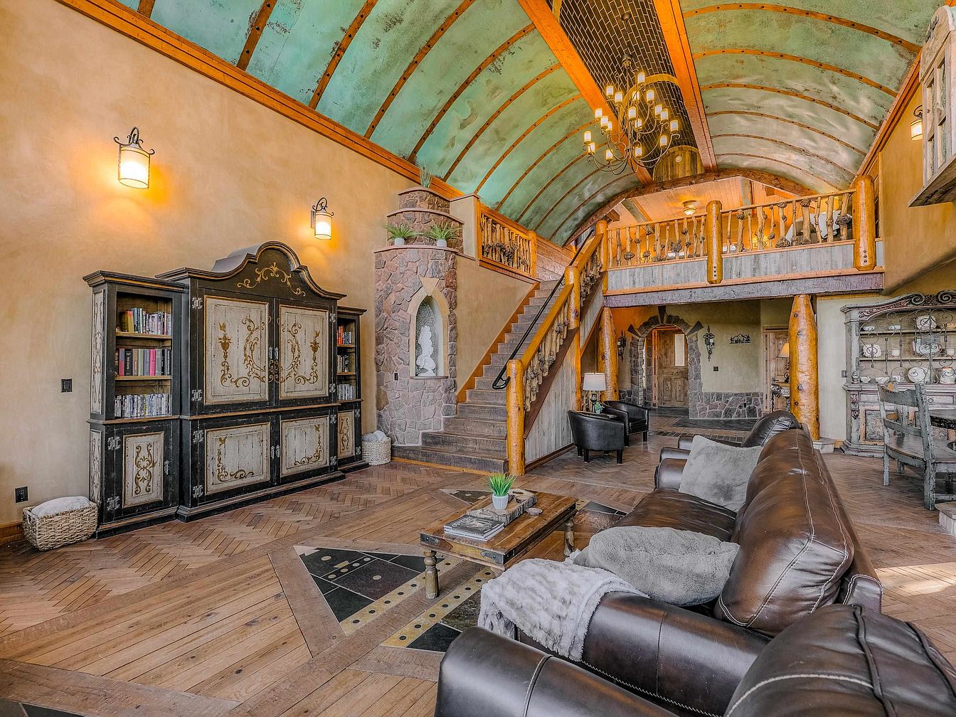 The living room features a grand, open layout with a striking vaulted ceiling adorned with a weathered turquoise finish. Exposed wooden beams provide a rustic charm, complemented by elegant light fixtures that enhance the space. A central staircase, flanked by unique stone walls, ascends to a second level, adding architectural interest. The rich hardwood flooring features a herringbone pattern, enhancing the room’s warmth. Plush brown leather seating invites comfort, while decorative elements, such as wall sconces and an antique cabinet, contribute to the room’s eclectic style. The overall aesthetic harmonizes rustic elegance with a welcoming atmosphere.
