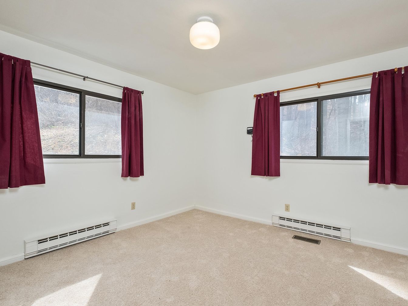 A modest bedroom featuring a minimalist design with neutral white walls providing a clean backdrop. Two large windows framed with deep burgundy curtains create a striking contrast and allow natural light to fill the room, enhancing its spaciousness. The flooring is covered in soft beige carpeting, contributing to a cozy atmosphere. A central ceiling light fixture adds brightness without overpowering the decor. Baseboard heating runs along the wall, offering comfort during colder months. The lack of furniture emphasizes the room’s simplicity, leaving ample space for personal touches, such as a bed or additional decor.