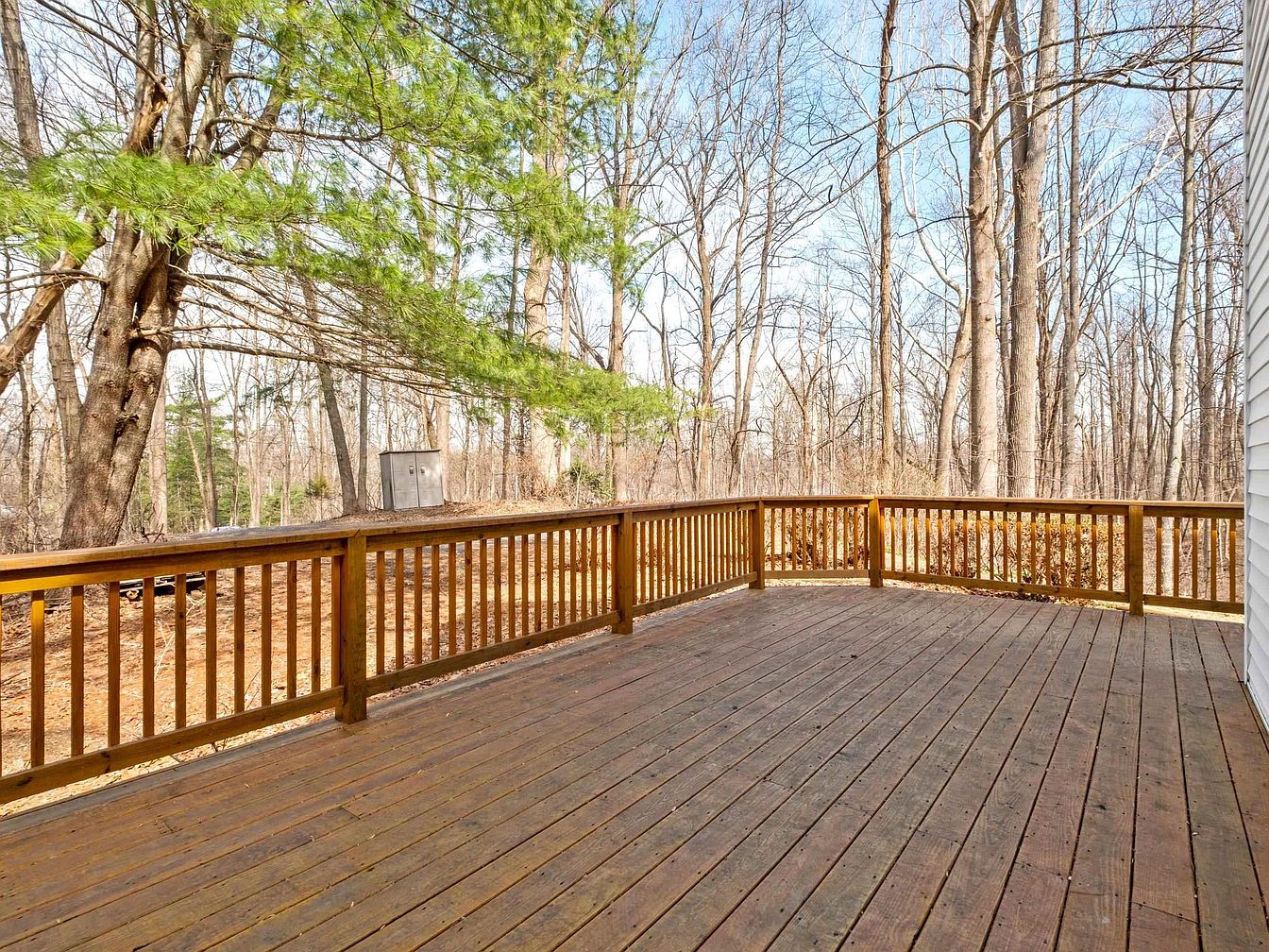 This spacious wooden deck extends out into a serene wooded landscape, showcasing a natural connection to the outdoors. The warm, rich tones of the wooden planks create an inviting atmosphere. Wooden railings line the perimeter, providing safety while maintaining an open view of the trees beyond. Surrounding the deck are tall, leafless trees and some green pine, enhancing the rustic charm. The decking is well-maintained, with slight weathering that adds character. This area serves as an ideal space for relaxation or social gatherings, inviting occupants to enjoy the tranquility of nature just steps away from the home.