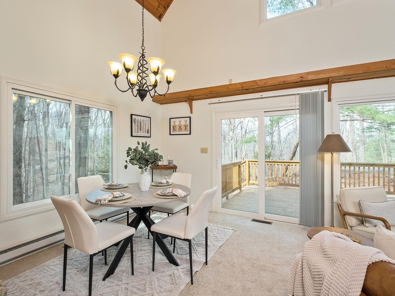 The dining area features a round table with a sleek, gray concrete top surrounded by four elegant white chairs. The light-colored carpet underfoot provides a soft contrast. A decorative chandelier hangs centrally, offering a warm glow. Large windows extend across one wall, framing a serene view of the wooded outdoors, enhancing the natural light. Nearby, a minimalistic side table holds a vase of greenery and decorative items, while a cozy armchair invites relaxation in the corner. Architectural details include exposed wooden beams on the ceiling, adding character and warmth to the modern space.