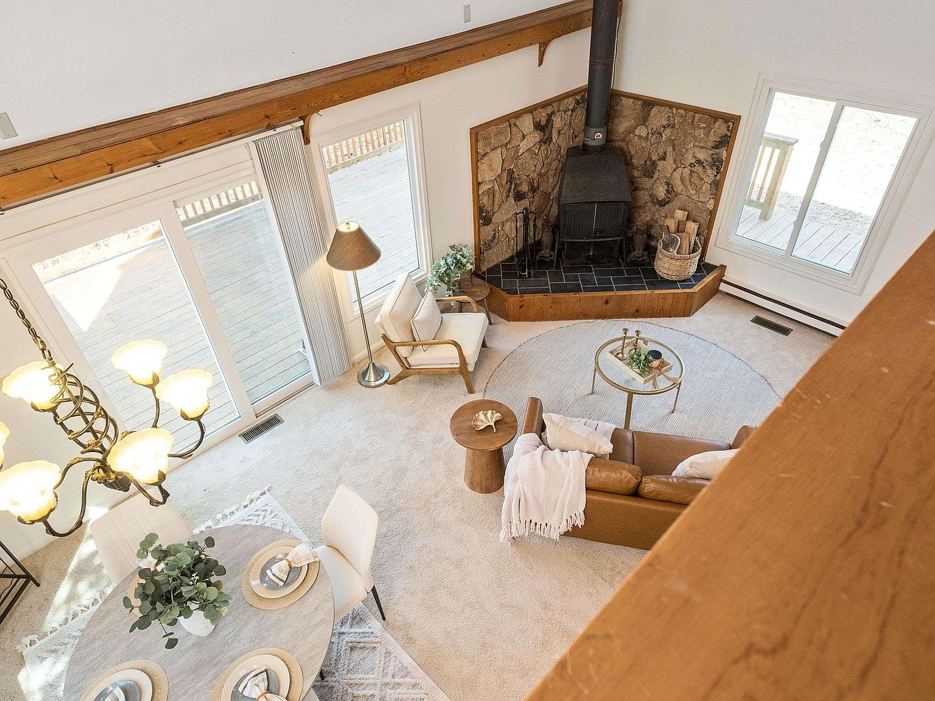 The living room features a cozy, inviting atmosphere with a high, vaulted ceiling accentuated by natural wood beams. A prominent black wood stove, situated on a rustic stone hearth, serves as a focal point. Light streams through a large window, illuminating the neutral color palette of white walls and cream carpeting. A plush, textured area rug grounds the space, while a round wooden coffee table adds a warm, organic touch. A light brown sofa, adorned with soft cushions and a cozy throw, complements the minimalist decor. An elegant floor lamp and potted greenery enhance the welcoming vibe.