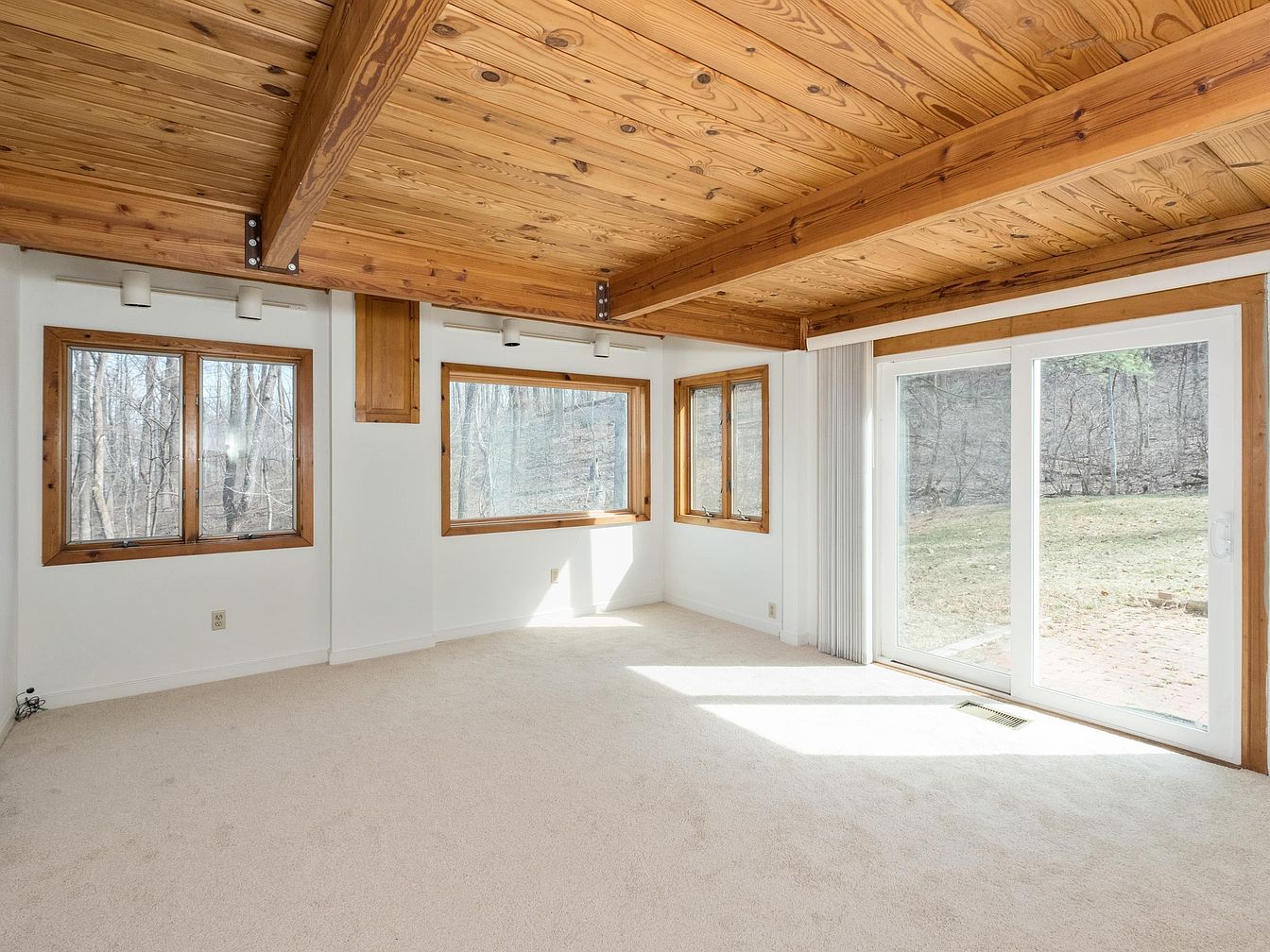 A bright sunroom featuring wooden beams and a spacious layout. The rich, warm tones of the wooden ceiling contrast with the white walls, creating a cozy atmosphere. Several large windows allow natural light to flood the space, offering views of the forest outside, framed by natural wood trim. A door leads to a patio, encouraging outdoor access. The soft, beige carpet adds comfort and warmth underfoot. Minimalist design elements are present, allowing the scenery to be a focal point. The room invites relaxation, with ample room for seating or plants, enhancing the connection to nature.