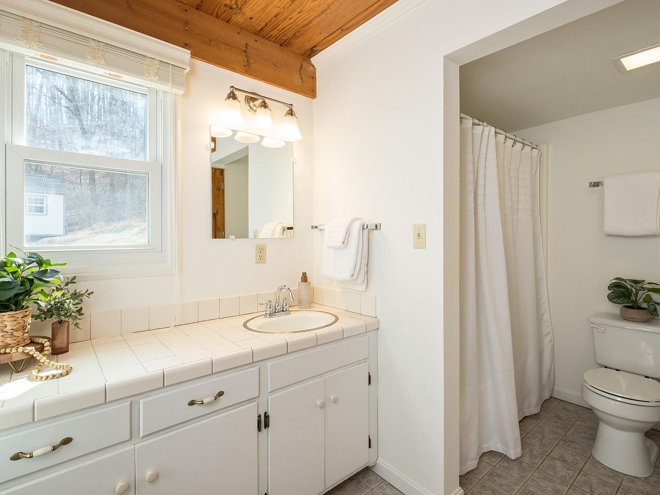 This bathroom features a clean, minimalist design with a bright, airy atmosphere. The white tiled countertop complements the cabinetry, which is equipped with brushed brass handles, enhancing the modern aesthetic. Natural light floods in through a large window adorned with simple blinds, illuminating a small indoor plant by the sink. A large mirror above the sink reflects light, creating an illusion of space. On the opposite side, a shower curtain partially conceals a shower area, while a neatly arranged towel rack displays plush white towels. The floor is laid with light gray tiles, contributing to the soothing ambiance.