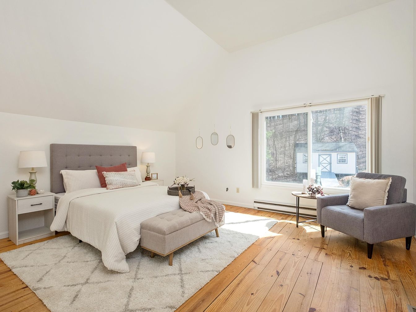 This serene bedroom features a light and airy color scheme dominated by soft whites and light grays. The focal point is a plush, gray upholstered bed complemented by a mix of decorative pillows, including a textured white throw. Flanking the bed are minimalist nightstands with elegant table lamps, creating a cozy atmosphere. A large window allows natural light to flood the space, showcasing a view of wooded surroundings. Adjacent to the bed, a comfortable gray armchair provides an inviting reading nook, while a soft, patterned area rug adds warmth to the hardwood floor.
