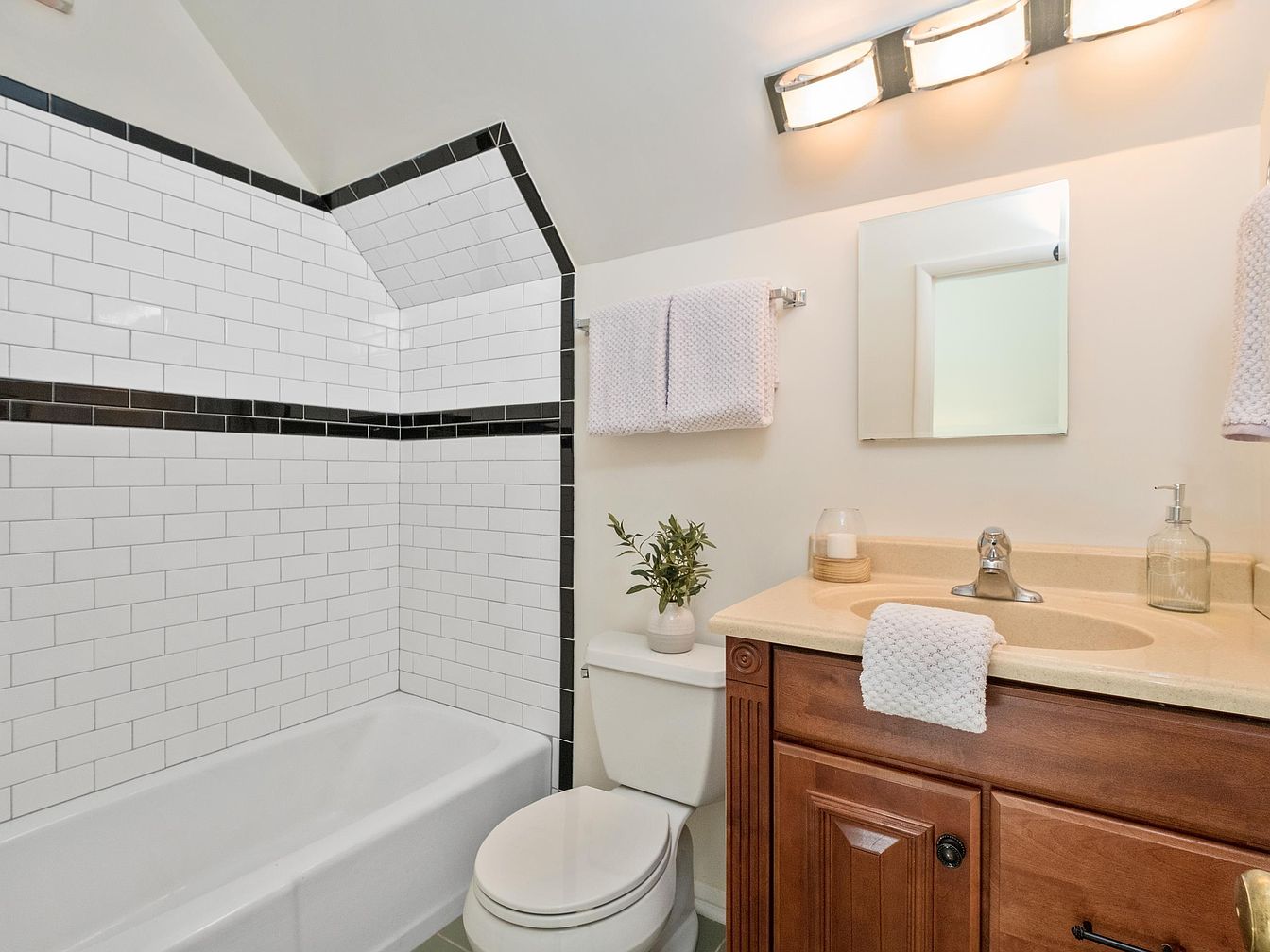 This bathroom features a modern take on traditional design with a stylish layout. The sloped ceiling creates an intimate atmosphere, while white subway tiles are accented with black trim, enhancing visual interest. A bathtub sits beneath the elegant tile work, offering a seamless transition between shower and bath. The vanity showcases rich wood tones, providing warmth and contrast to the light-colored countertop. Soft towels hang nearby, adding a touch of comfort. A small plant adds a hint of greenery to the space, while recessed lighting ensures a bright, inviting environment for personal grooming and relaxation.