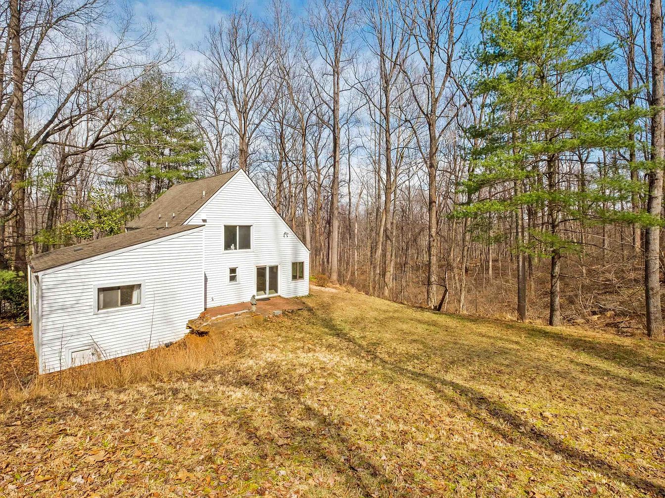 This image shows the rear exterior of a historic American home nestled in a wooded area. The house features a classic gable roof and is clad in white siding, creating a stark contrast against the natural backdrop. Large windows allow ample natural light in, enhancing the inviting feel of the space. The yard is expansive, with dry grass and scattered fallen leaves indicating the change of seasons, and the distant trees add a sense of tranquility. The patio area is modest, with stone steps leading up to the entrance. Overall, the aesthetic conveys a blend of rustic charm and peaceful solitude.