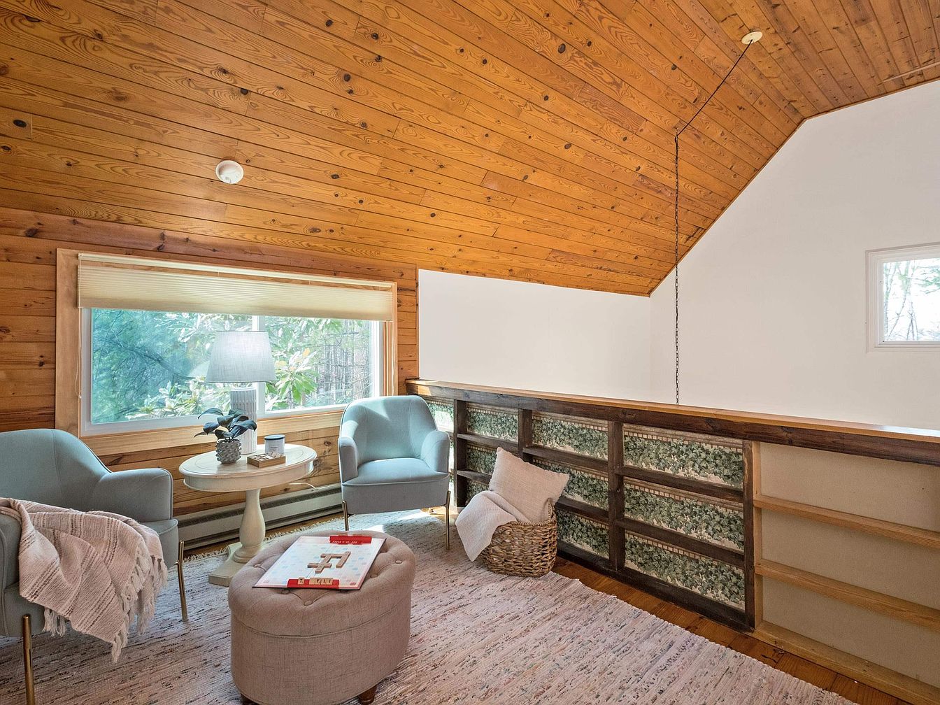 A warm, inviting space with a sloped wooden ceiling made of rich, honey-toned planks. The walls are adorned with natural wood, complemented by a large window that offers soft natural light, showcasing the outdoor greenery. Two soft, pastel blue chairs sit opposite a round coffee table, each inviting relaxation. A patterned area rug adds a touch of warmth underfoot. A small modern lamp illuminates the scene, while decorative items neatly arranged on the table hint at a cozy, personal touch. The unique shelving with floral wallpaper accentuates rustic charm, harmonizing with the overall tranquil aesthetics.