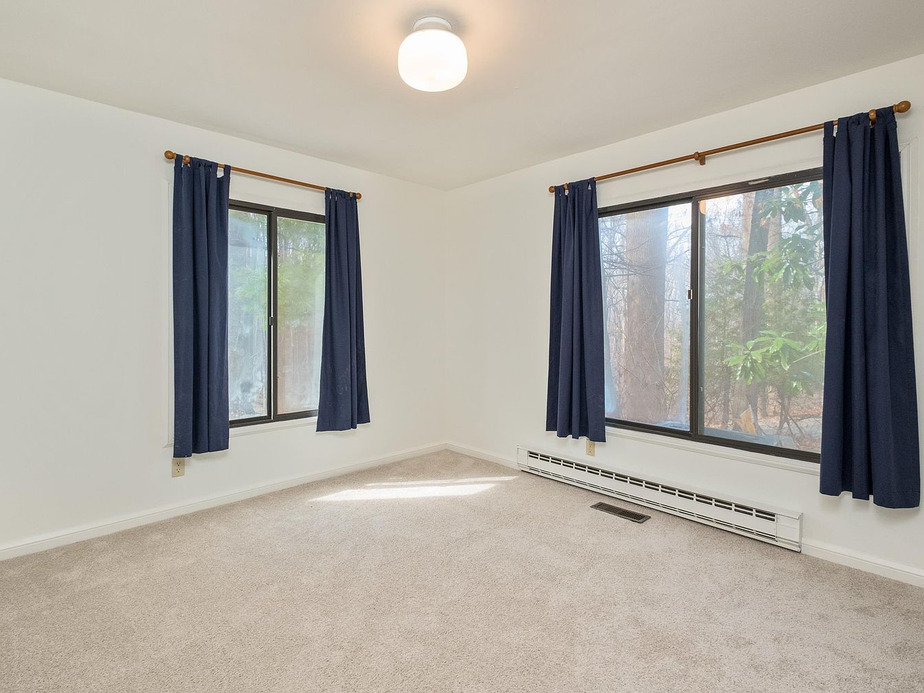 This tranquil bedroom features two large windows flanked by rich navy blue curtains, allowing ample natural light to filter in. The walls are painted a soft white, enhancing the room’s spacious feel. A plush beige carpet covers the floor, providing warmth and comfort underfoot. The ceiling is adorned with a simple, modern light fixture, offering bright illumination. Below the windows, a sleek heating vent is visible, subtly integrated into the design. The overall aesthetic is minimalist, creating an inviting and serene atmosphere. This space is ideal for relaxation, with a cozy ambiance complemented by the views of greenery outside.