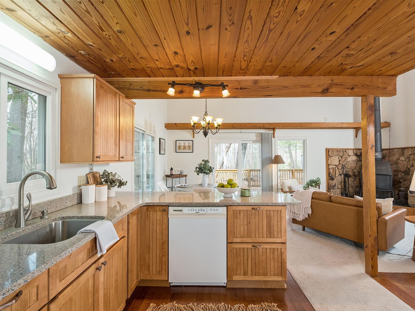 This kitchen area features a blend of natural wood elements and modern finishes. The ceiling boasts exposed wooden beams, enhancing rustic charm, while the honey-toned cabinetry offers warmth. A large granite countertop provides ample space for meal prep, paired with a stainless-steel sink and dishwasher. Bright natural light floods the room through large windows, highlighting the open layout. To the side, a cozy seating area is visible, with a leather sofa and soft textiles, creating an inviting atmosphere. Decorative accents like potted plants and framed art pieces add a personal touch, contributing to the homey aesthetic.