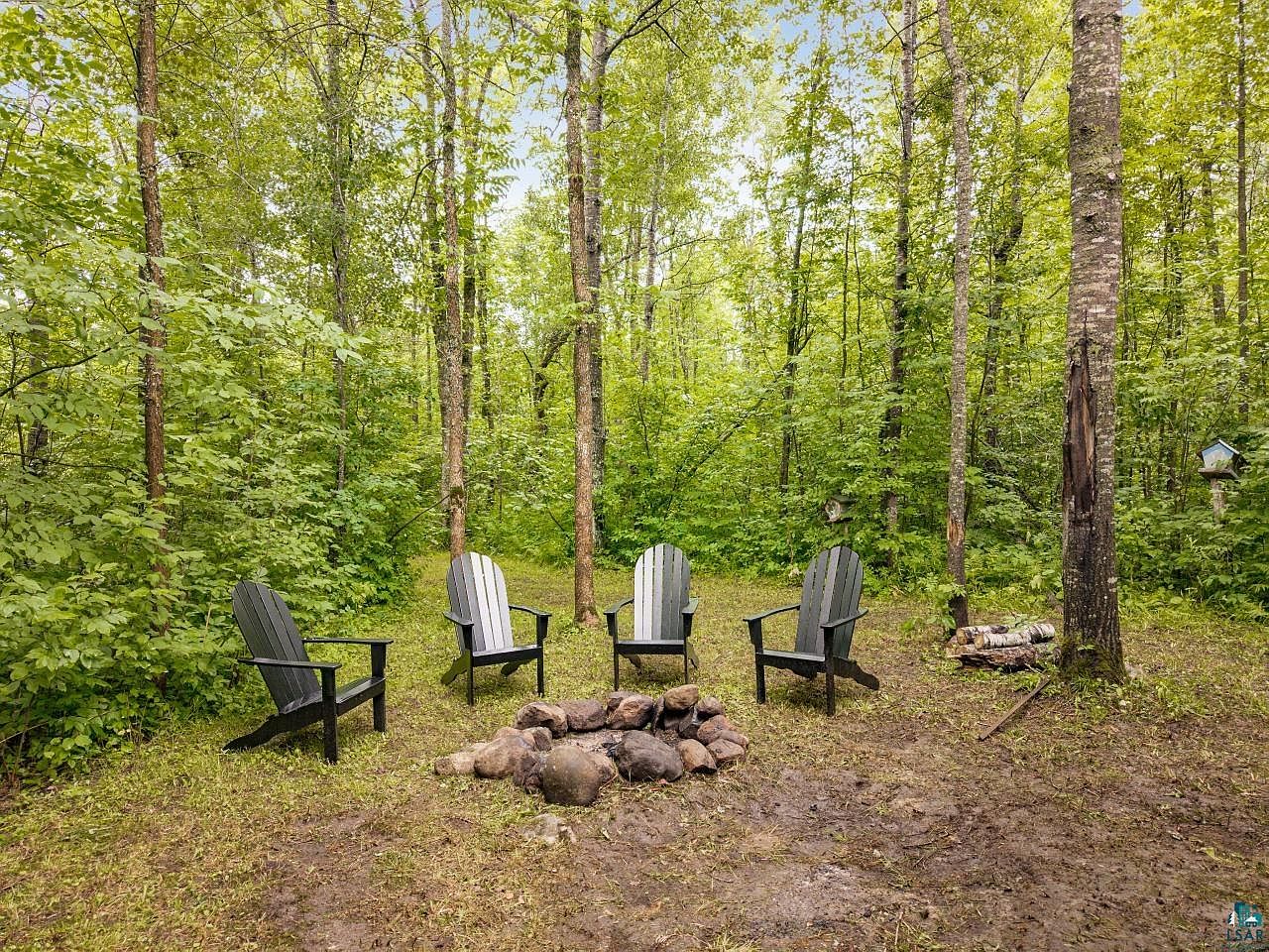 A peaceful outdoor seating area nestled among tall, leafy trees, creating a private and nature-filled setting for families to unwind together. Four sturdy, dark wooden Adirondack chairs circle a rustic stone firepit, inviting warmth and conversation. The ground is a mix of soft grass and natural earth, while the surrounding forest adds a lush green backdrop ideal for relaxation or playing children. There are logs and a birdhouse nearby, providing space for activities and attracting local wildlife. The area is open, spacious, and perfect for evening gatherings, campfire stories, or safe family fun surrounded by nature.