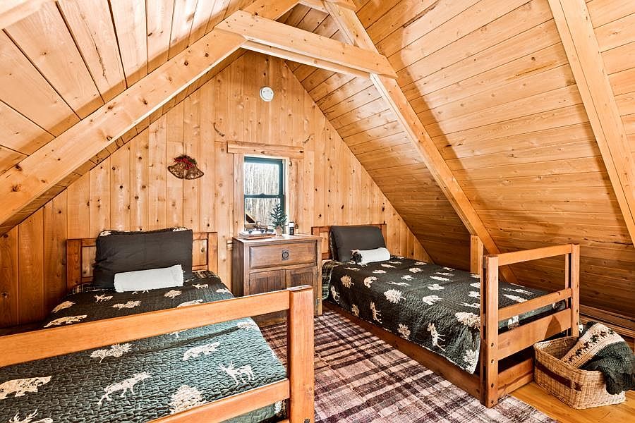 This inviting attic bedroom features two twin beds with sturdy wooden frames, positioned parallel on either side of a central window. The room is encased in beautifully finished natural wood paneling, giving it a cozy, rustic cabin feel that is both warm and welcoming for families. The beds are dressed in matching forest-themed bedding, adding a playful yet nature-inspired touch ideal for children. A vintage wooden dresser sits beneath the window, and a woven basket filled with blankets enhances comfort and convenience. The sloped ceiling and exposed beams contribute architectural interest, while a soft plaid rug unifies the space, ensuring a child-friendly and tranquil retreat.