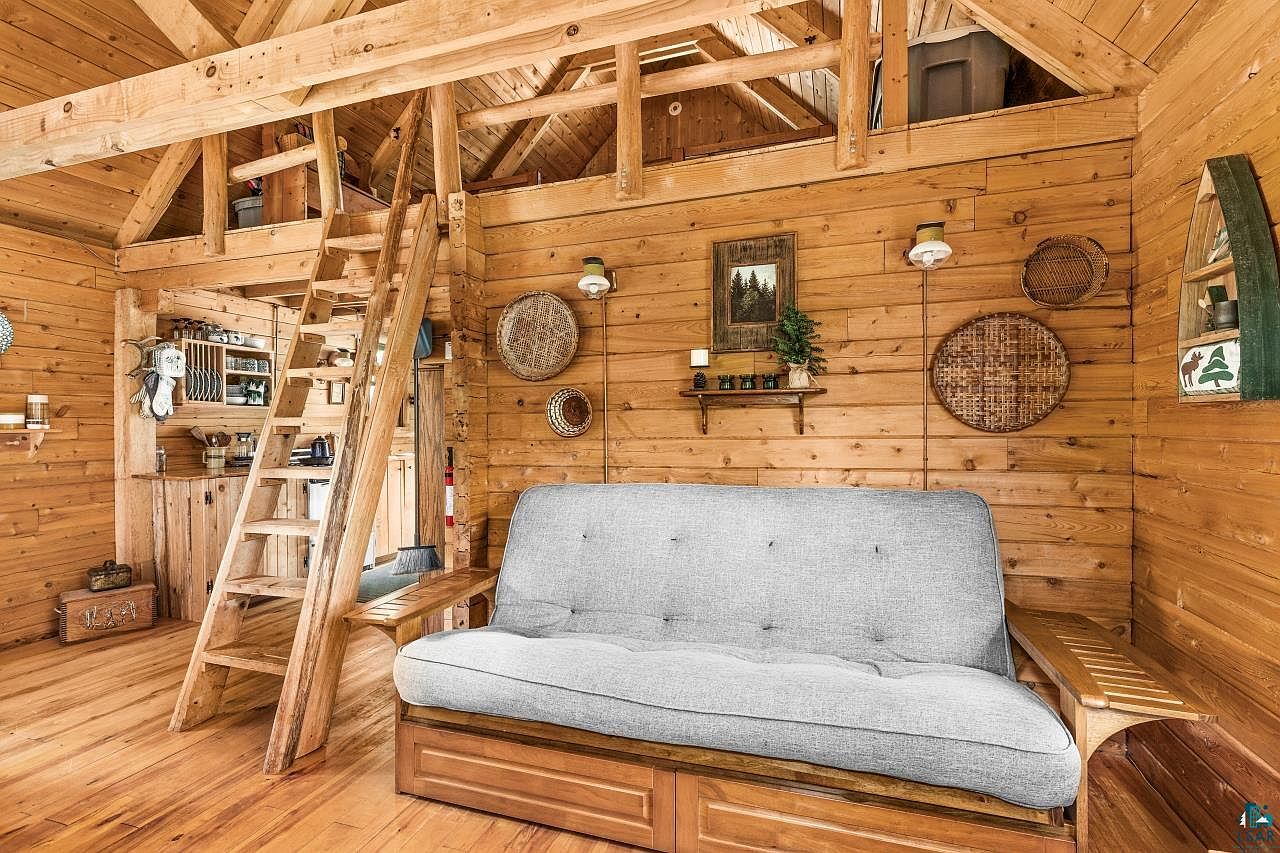 A warm, inviting living room made entirely of honey-toned wood with a rustic cabin aesthetic. A sturdy wooden ladder leads to a cozy loft, perfect for kids or extra storage, adding a sense of adventure for family living. The space features a light gray futon with wooden armrests, ideal for both relaxing and hosting guests. Baskets and framed art hang on the walls, offering a personalized and homely touch. Open shelves, soft lighting, and forest-themed décor reflect a natural, family-friendly environment, encouraging gatherings and creative play in a bright and spacious atmosphere.