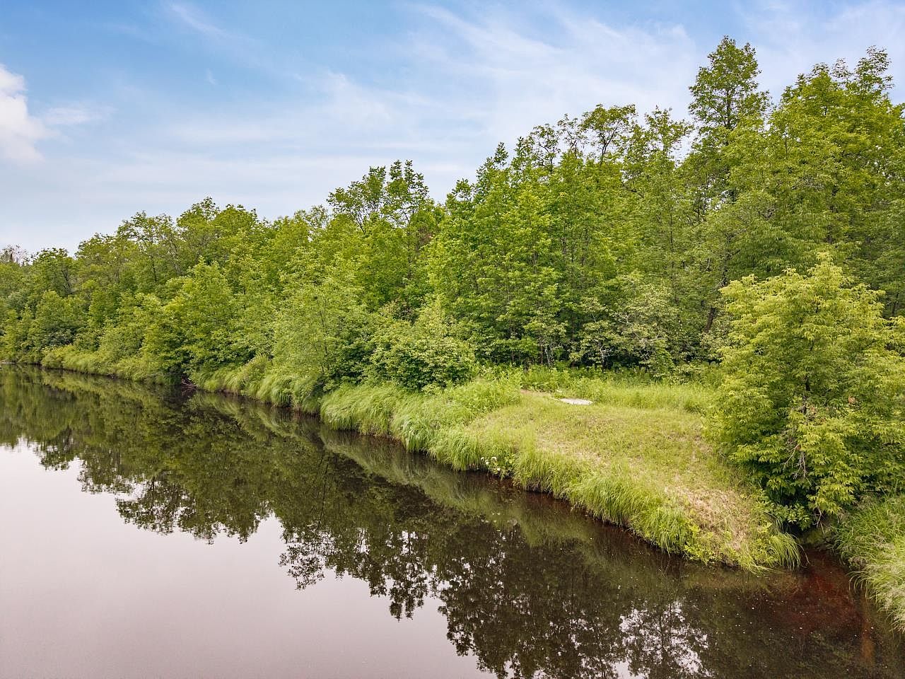 A peaceful backyard setting features a private stretch of river bordered by vibrant green trees and lush grass. The gently curving river creates a natural retreat perfect for family outings, fishing, or picnics by the water. Dense forest surrounds the area, ensuring privacy and a sense of seclusion while still allowing for open space along the riverbank. The landscape showcases natural beauty, with an abundance of greenery and a clear sky overhead. Ideal for families who love outdoor activities and picturesque views, this serene backyard setting encourages time spent together in nature.
