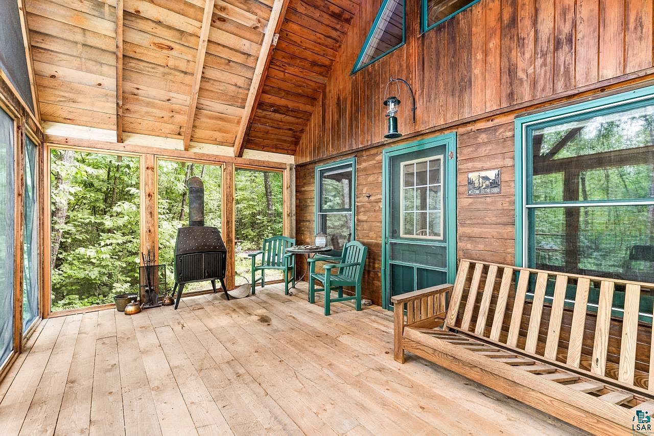A spacious screened porch features natural wood plank flooring and warm, honey-toned wooden walls. This inviting space offers comfortable seating with a rustic wooden bench and a pair of green chairs arranged around a small table, ideal for family gatherings or morning coffee. The exposed rafters and cathedral ceiling add an airy, open feeling, while large screened windows surround the porch, offering tranquil woodland views and plenty of natural light. A unique wood-burning stove stands in one corner, perfect for cozy evenings or marshmallow roasting with kids. The thoughtful design creates a safe, relaxing, and family-friendly atmosphere for all seasons.