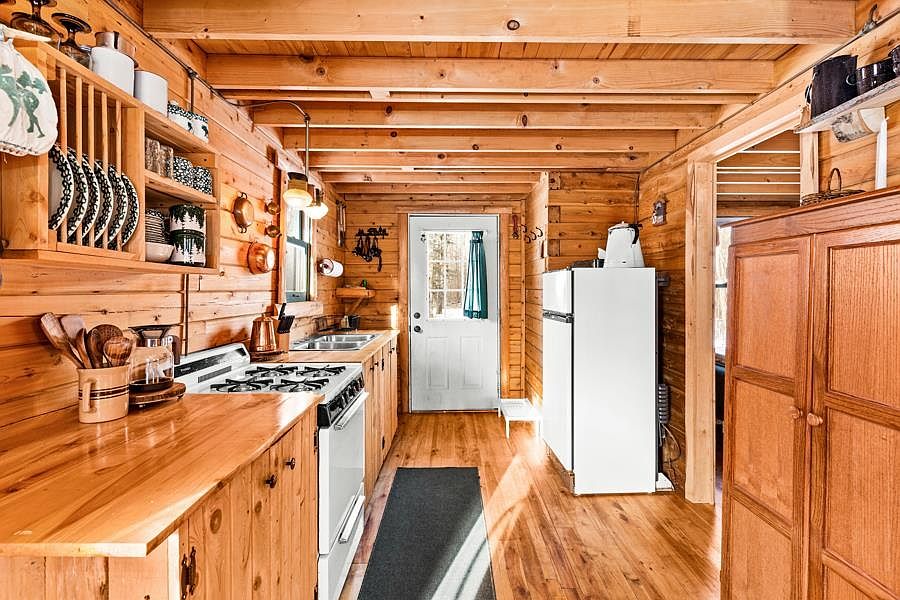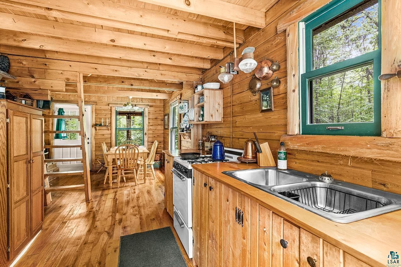 Warm wood tones fill this galley kitchen, with exposed beams and pine-paneled walls creating a cozy, rustic environment perfect for families. The long wooden countertop offers ample workspace for meal preparation, while a gas stove, deep sink, and white appliances provide functional comfort. Open shelving displays neatly arranged dishes and cookware, making it easy to grab essentials and encouraging shared family cooking. Large windows and a glass-panel exterior door draw in natural light, highlighting the bright, welcoming feel. The durable hardwood flooring and generously sized pantry ensure the space can handle everyday family living with ease and charm.