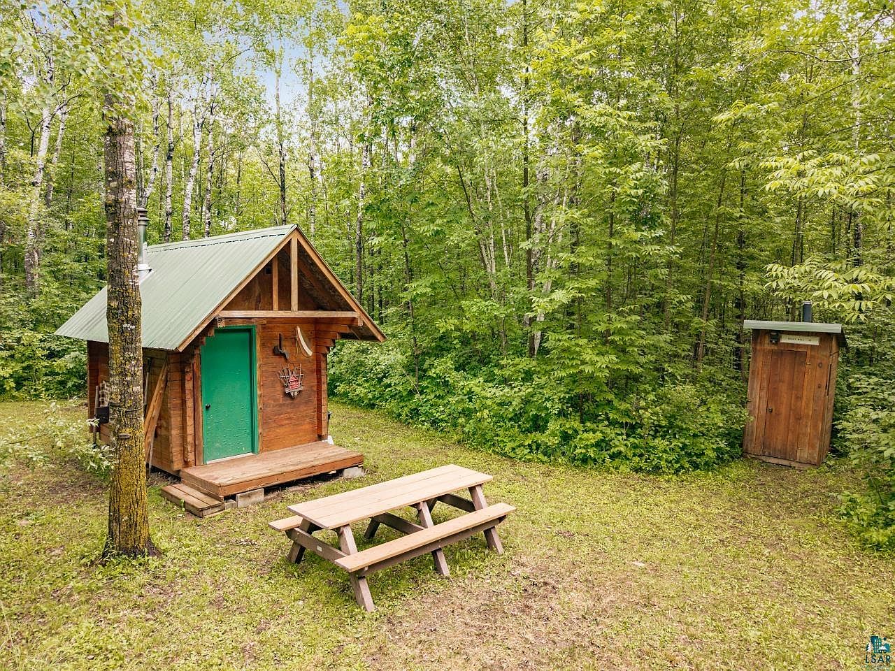 Nestled within a lush, wooded setting, this cozy backyard area features a charming wooden cabin with a green door and metal roof, perfect for family retreats or quiet getaways. In front of the cabin, a sturdy wooden picnic table provides ample space for outdoor dining, making it ideal for family gatherings, picnics, or games with children. To the side, a rustic wooden outhouse is conveniently located just off the open grassy area, offering practical facilities while maintaining the natural aesthetic. Surrounded by tall, leafy trees, the space exudes a calming, rustic vibe, fostering both relaxation and outdoor play.