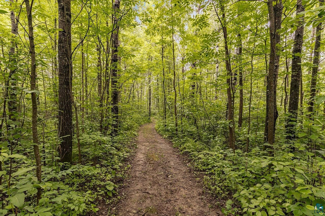 A wide, gently winding dirt path meanders through a lush, wooded landscape filled with tall, slender trees and dense undergrowth. The overhead tree canopy filters soft daylight, creating a tranquil and inviting green glow. This outdoor feature offers a peaceful, family-friendly environment perfect for walking, exploring, and immersing in nature. Children can safely discover and play among the natural surroundings, while adults can enjoy scenic strolls or quiet moments. The setting is defined by earthy brown tones of the trail and varying shades of vibrant green from leaves and foliage, enhancing the wholesome, natural aesthetics of the property.