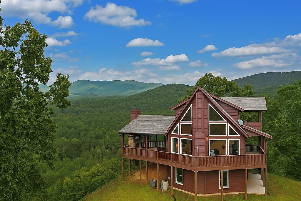 The image presents the front exterior of a cozy wooden cabin nestled within a lush green forest, ideal for families seeking tranquility and privacy. The house features a classic A-frame design with a steep green metal roof and natural wood siding, blending seamlessly with the surrounding trees. A wide front porch adorned with two simple chairs and a small red table offers a welcoming space for fresh air and gathering. The steps and gentle elevation provide easy entry, making it accessible for all ages. Warm wood tones and rustic accents create a charming, family-friendly atmosphere perfectly integrated with nature.