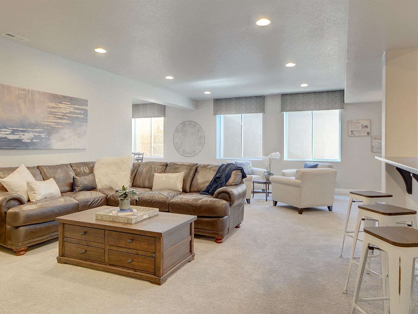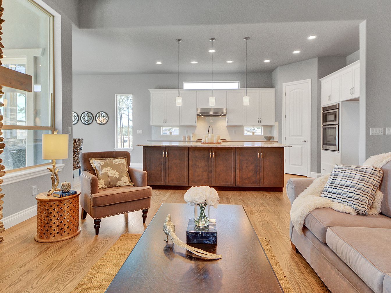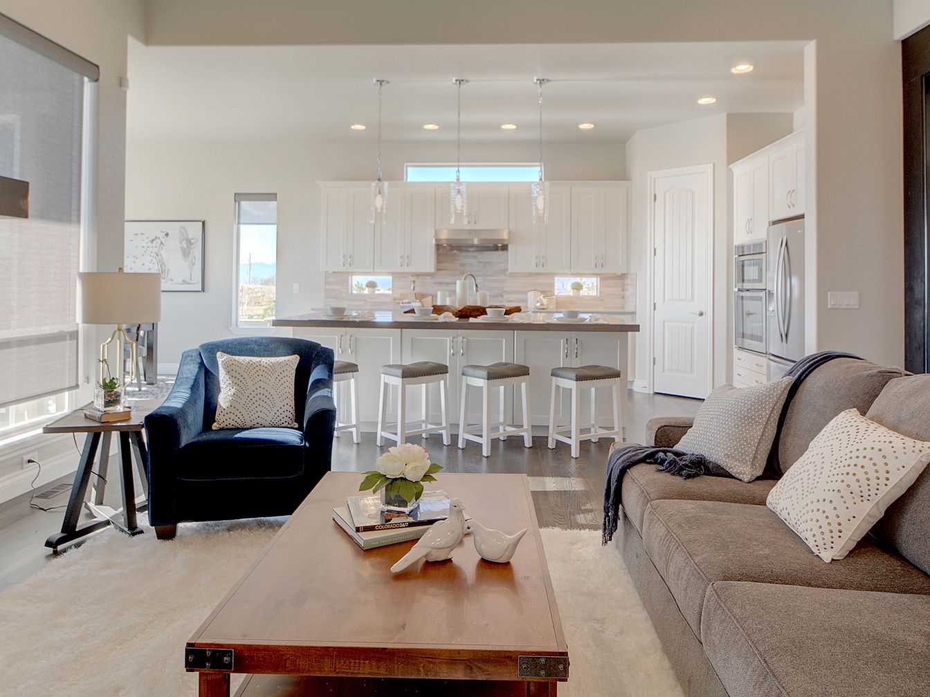 This living room features a cozy and inviting ambiance, highlighted by a plush, gray sectional sofa adorned with decorative pillows in warm tones. A rustic wooden coffee table sits atop a soft, shaggy rug, enhancing comfort. A bold navy blue accent chair, with a dotted pillow, complements the space. The kitchen area, seamlessly integrated, displays sleek white cabinetry and a modern island with bar stools, framed by pendant lighting that adds a touch of elegance. Large windows invite natural light, while neutral tones and wood flooring contribute to a warm, contemporary aesthetic. Overall, the space balances style with functionality.