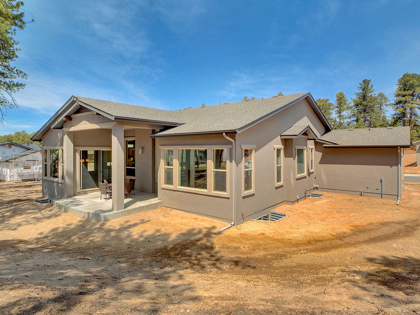 The image showcases an exterior view of a contemporary home with a blend of modern and traditional architectural features. The neutral beige and light gray color scheme creates a warm, inviting atmosphere. A covered porch is highlighted with subtle wooden beams, providing a cozy entrance. Large, strategically placed windows allow natural light to flood the interior while offering picturesque views of the surrounding landscape. The well-maintained yard features minimal landscaping, focusing on natural earth tones. The roof is a gentle slope, contributing to the home’s overall aesthetic harmony with the serene setting of tall pine trees in the background.