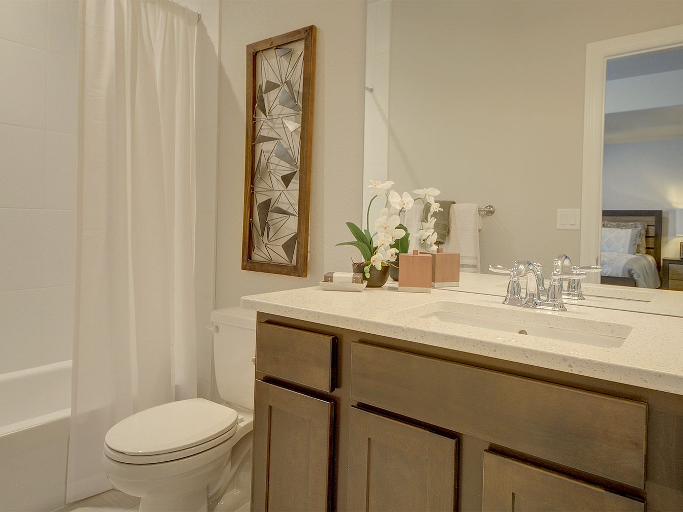 A compact bathroom featuring a blend of modern and classic design elements. The countertop, made of white speckled stone, contrasts nicely with the dark, wooden cabinetry below, providing warmth. A slim, framed mirror enhances the sense of space, reflecting a minimalist aesthetic. A sleek chrome faucet adds a contemporary touch. The bathtub is enclosed with a flowing white shower curtain that softens the room. Decorative details include a geometric wall art piece and a delicate white orchid plant, bringing a pop of nature inside. Soft neutral walls create an inviting atmosphere, perfect for relaxation.